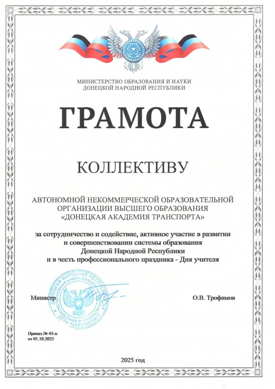 В честь профессионального праздника – Дня учителя, Донецкая академия транспорта награждена за сотрудничество и содействие, активное участие в развитии и совершенствовании системы образования Донецкой Народной Республики грамотой Министерства образования и науки ДНР.