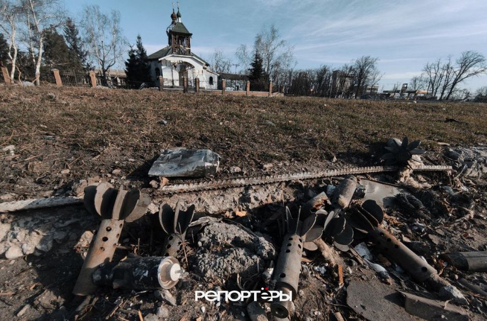 Заехали в центр города. Тут в глаза бросились остовы бронетехники. Разобрать, где чья, не представлялось возможным. Только по направлению пушек можно было догадаться, чьи останки мы наблюдаем. Бойня тут была знатная. Один из первых танковых боев. Еще до войны дронов. Человек на человека, техника на технику, с глазу на глаз. Рядом с этим побоищем расположилась небольшая церквушка. Купол выгорел, стены посечены, перед входом зияла огромная воронка. Вокруг того, что от нее осталось, были разбросаны снаряды, хвостовики и осколки.