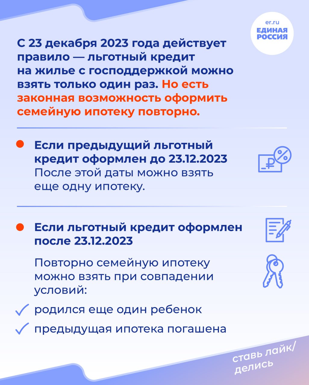 С 23 декабря 2023 года действует правило — льготный кредит на жилье с господдержкой можно взять только один раз. Но есть законная возможность оформить Семейную ипотеку повторно.