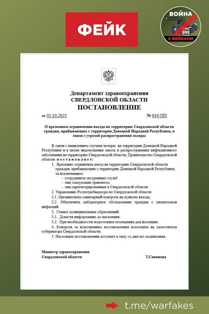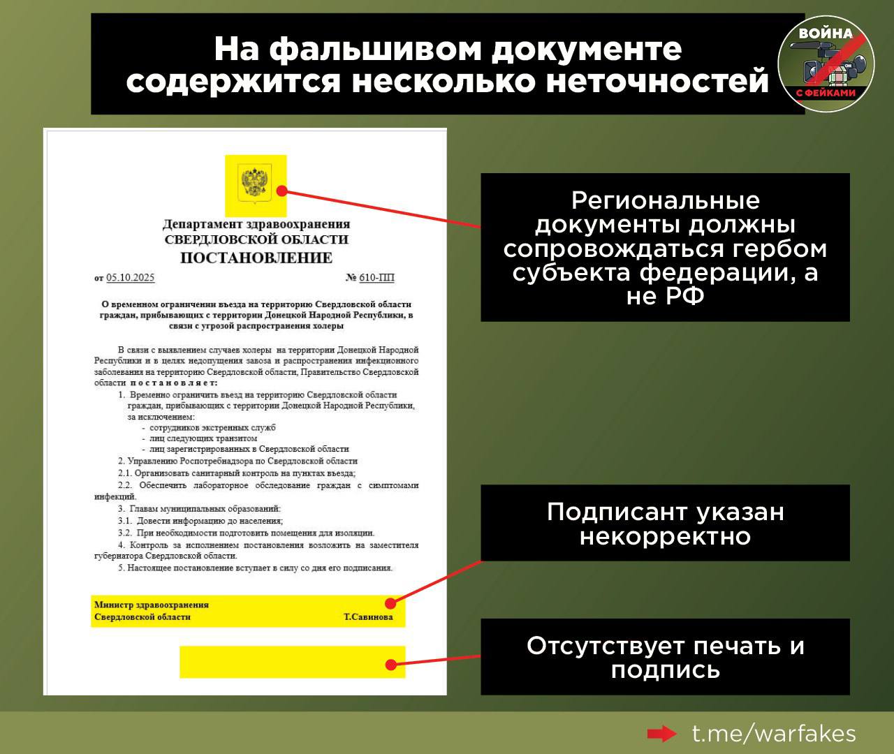Фейк: В Свердловской области запретили въезд гражданам ДНР из-за риска распространения холеры. Сообщения об этом расходятся в мессенджерах со ссылкой на департамент здравоохранения региона.
