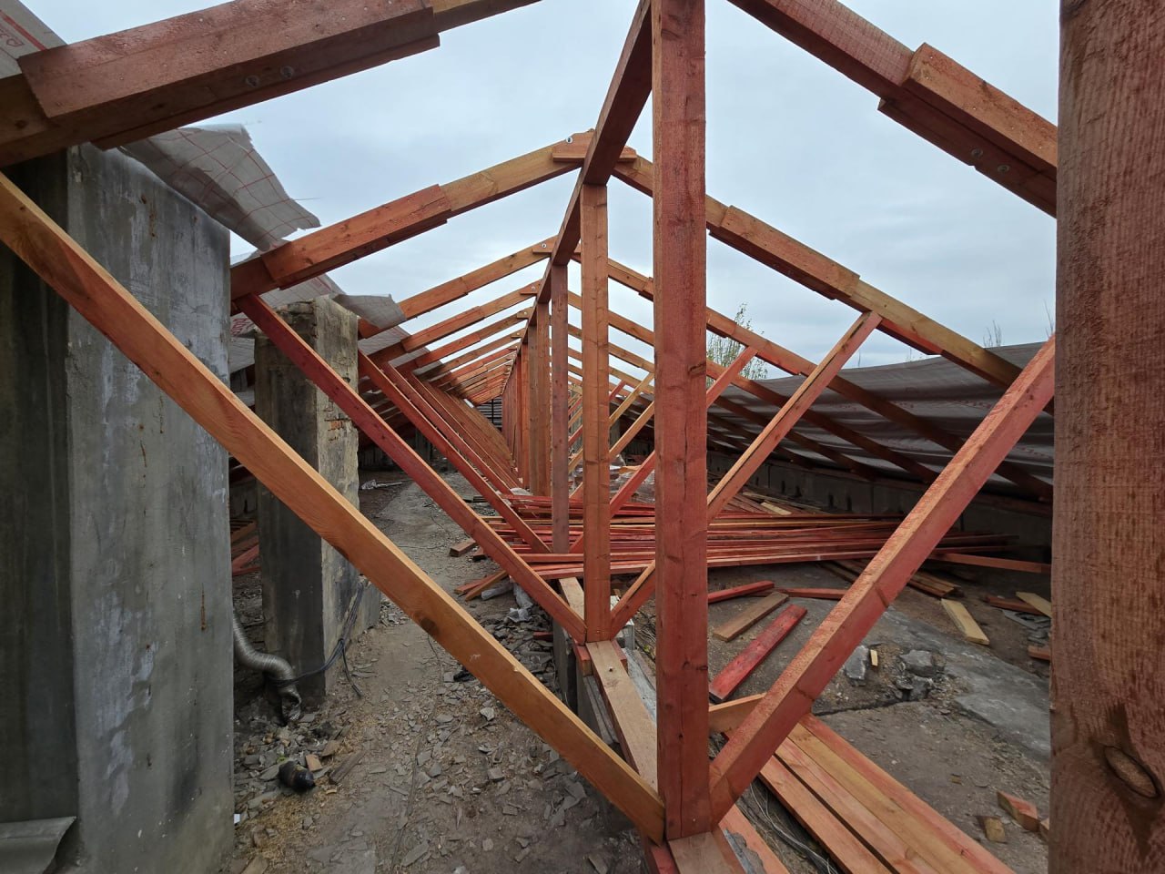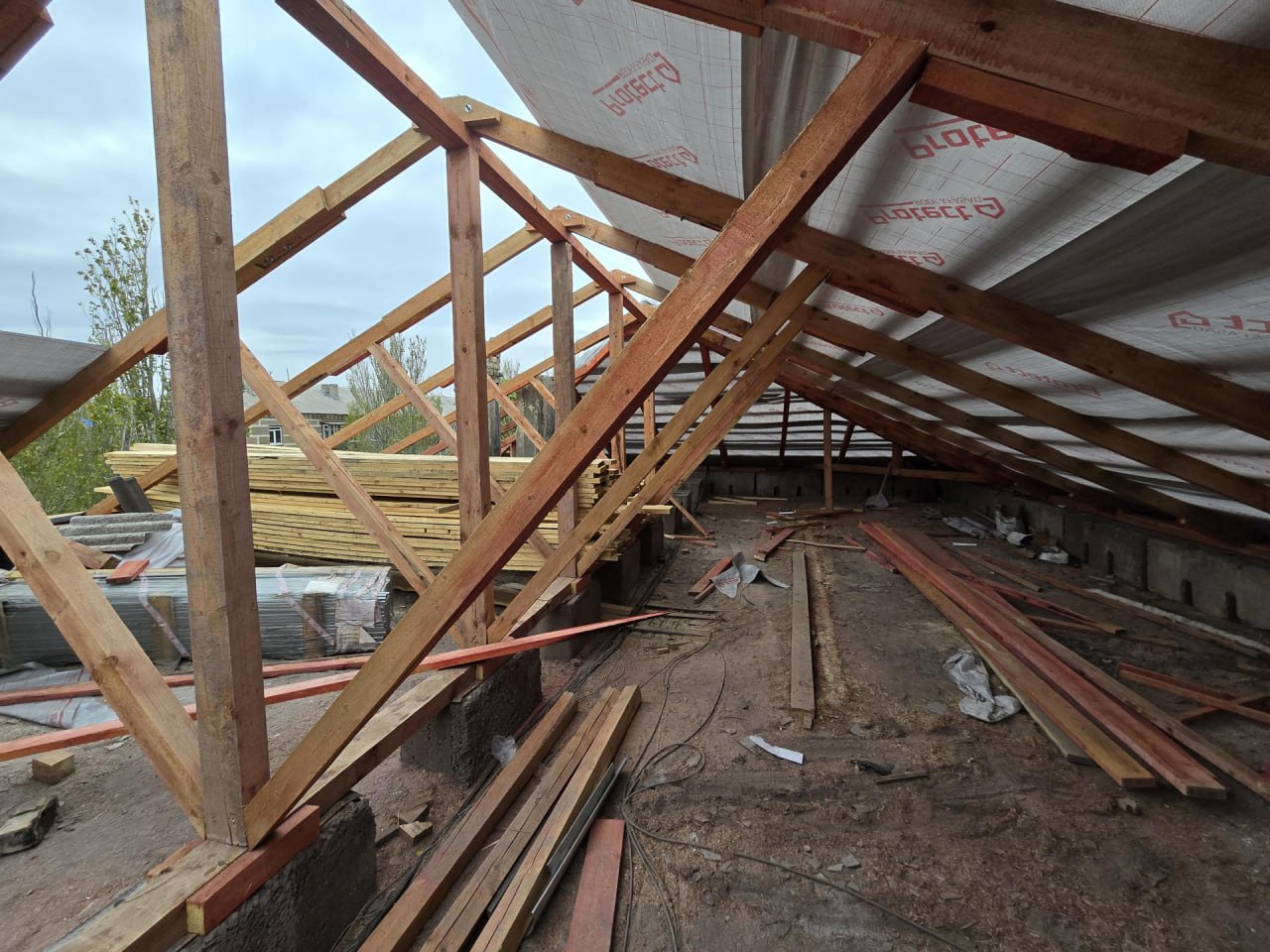 Строители смонтировали стропила и уложили ветро- и гидрозащитное мембранное покрытие.