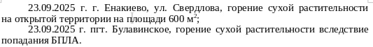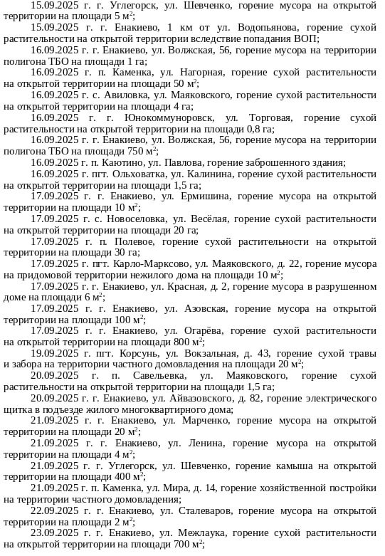 Согласно предоставленнойотделом надзорной деятельности и профилактической работы городского округа Енакиево Управления надзорной деятельности и практической работы Главного управления МЧС России по ДНРинформации в период с 08:00 10 сентября 2025 г. по 08:00 24 сентября 2025 г. на территории городского округа Енакиево было зарегистрировано 51 сообщение о пожаре.