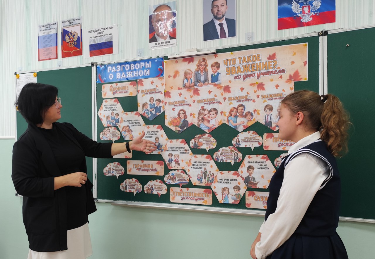 Сегодня в школах, техникумах и колледжах Донецкой Народной Республики прошли занятия проекта «Разговоры о важном». Тема урока посвящена уважению и приурочена ко Дню учителя.