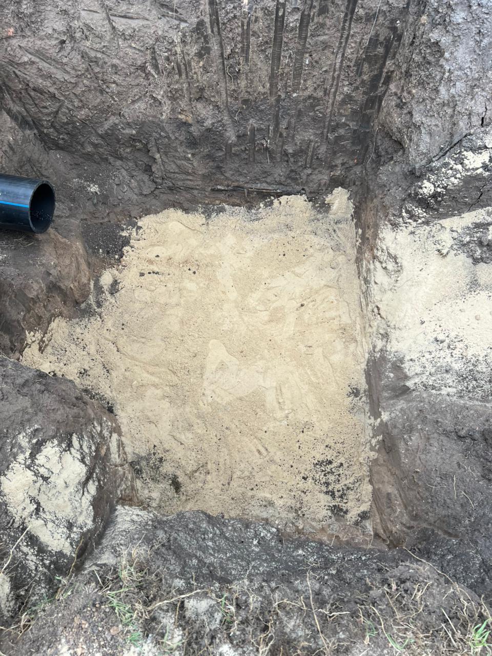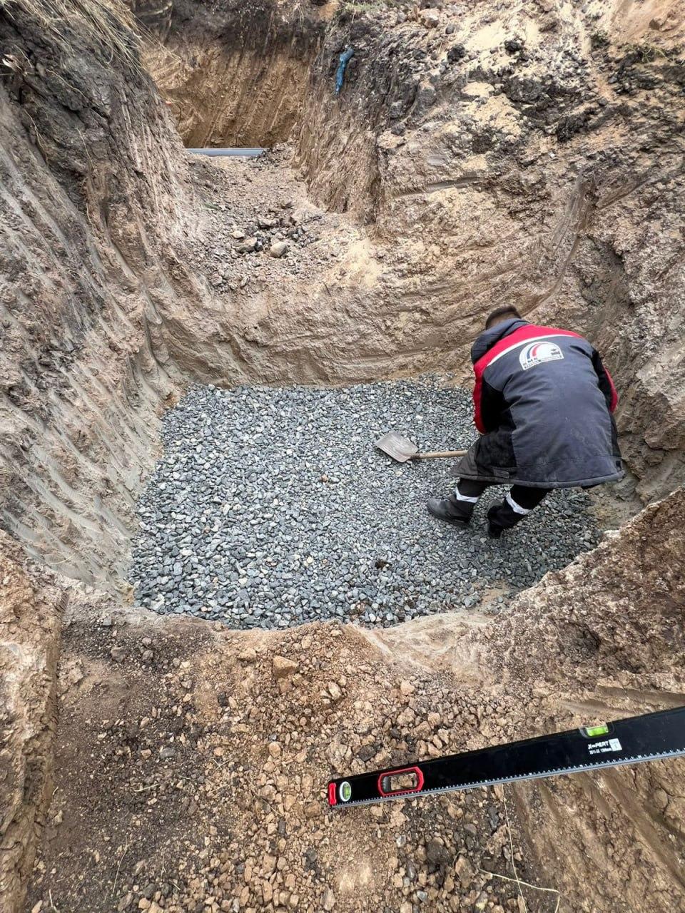 Параллельно специалисты ведут работы по формированию многослойной песчано-щебеночной подушки, установке футляров для водопроводных труб — гильз, а также самих колодцев.