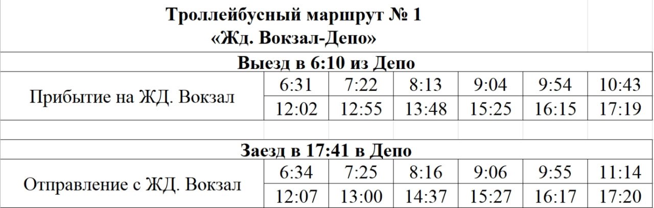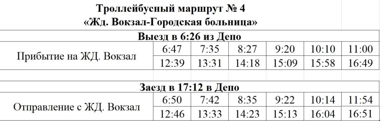 Расписание движения троллейбусов, осуществляющих движение по маршрутам № 1 "Жд.Вокзал - Депо" и № 4 "Жд. Вокзал - Городская больница"