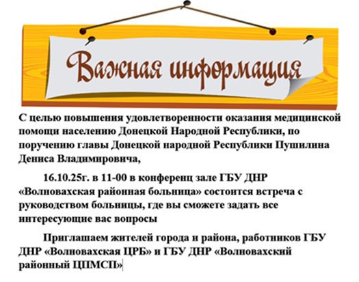 16.10.2025 года в 11:00 в конференц зале ГБУ ДНР "Волновахская районная больница" состоится встреча с руководством больницы, где вы сможете задать все интересующие вас вопросы.