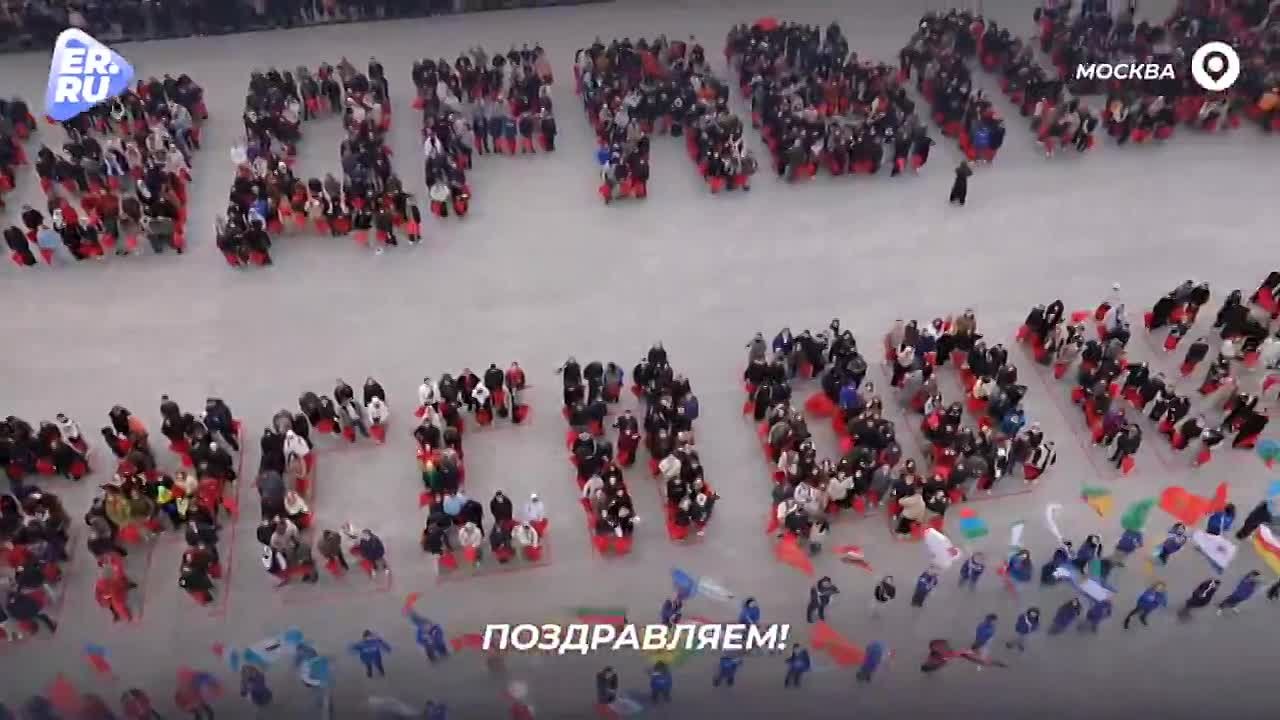 Тысячи активистов «Молодой Гвардии» и «Волонтерской Роты» вышли на акции в регионах. В Москве они выстроились в живую надпись «Поздравляем от Донбасса до Камчатки» и подняли флаги всех 89 регионов.