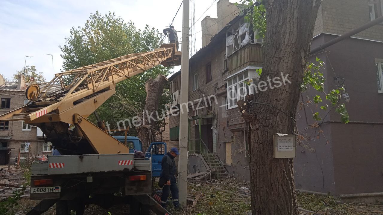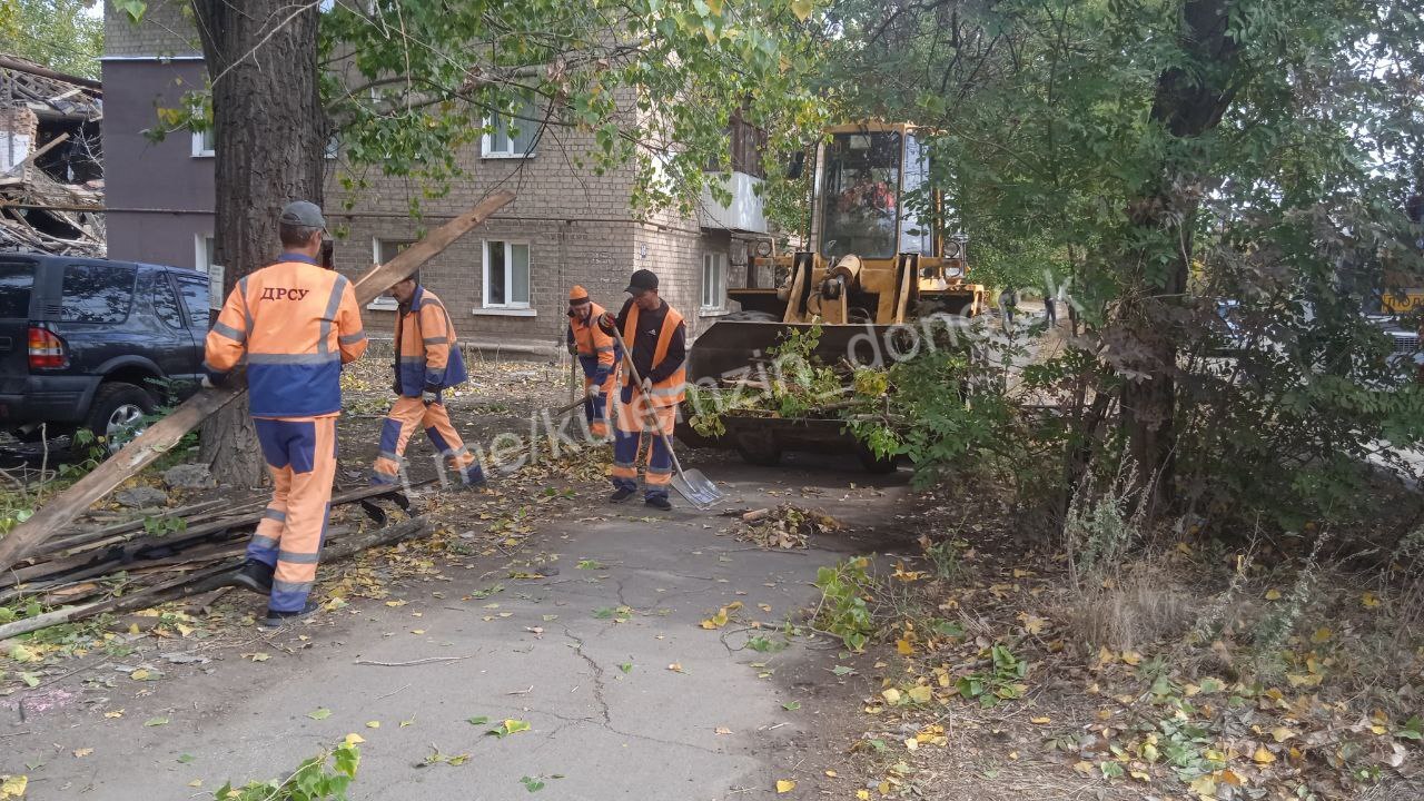 Специалисты предприятий «Дорожное ремонтно-строительное управление» и «Донецкгорсвет» продолжают устранять последствия на месте обстрела.