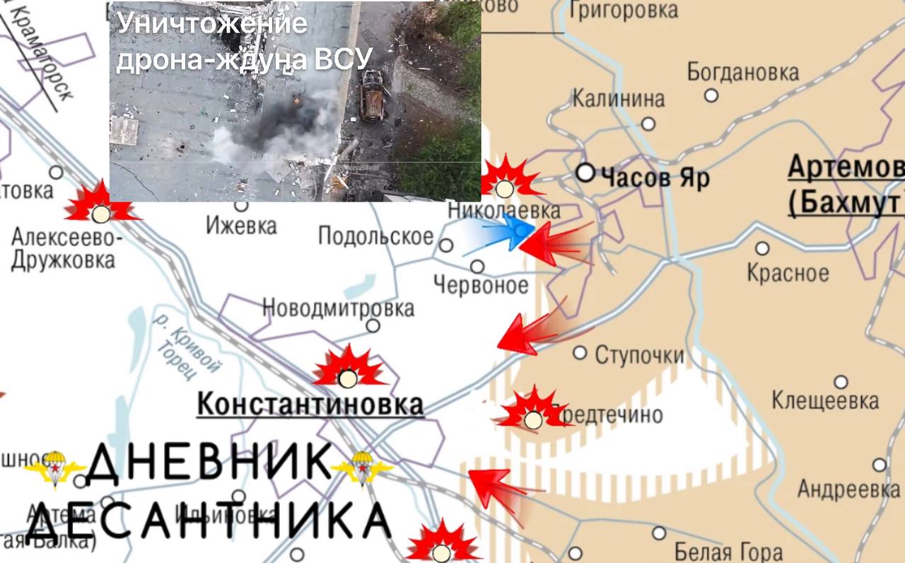 Часов Яр практически освобождён, осталось выбить ВСУ из территории западнее Днепровского пруда и западных окраин микрорайонов Южный и Шевченко;На окраинах города ВСУ на крышах домов, вдоль дорог, на ровных площадках сажают снаряженные боевой частью дроны в режим ожидания, так называемые "ждуны". Далее с разведдрона подается команда и они взлетают и наносят удары по цели. Операторы БПЛА ВДВ ежедневно выявляют и уничтожают такие дроны;