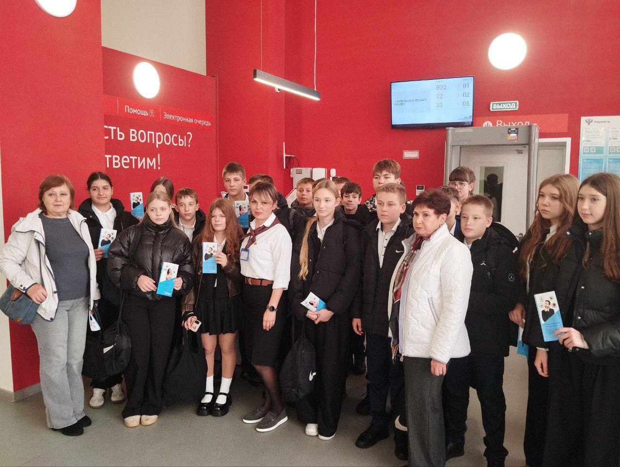 Ребятам рассказали об основных принципах работы учреждения, о том, что в настоящее время в центре оказывается более 100 различных услуг. Школьники также побывали в зале для работы с клиентами.