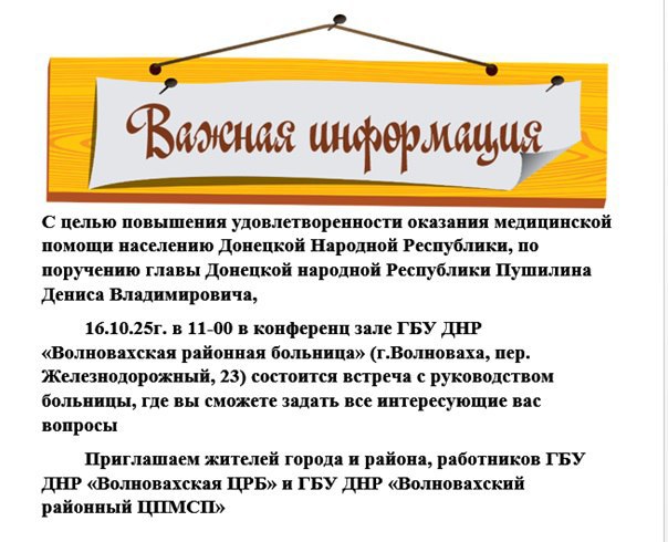 16.10.2025 года в 11:00 в конференц зале ГБУ ДНР "Волновахская районная больница" состоится встреча с руководством больницы, где вы сможете задать все интересующие вас вопросы.