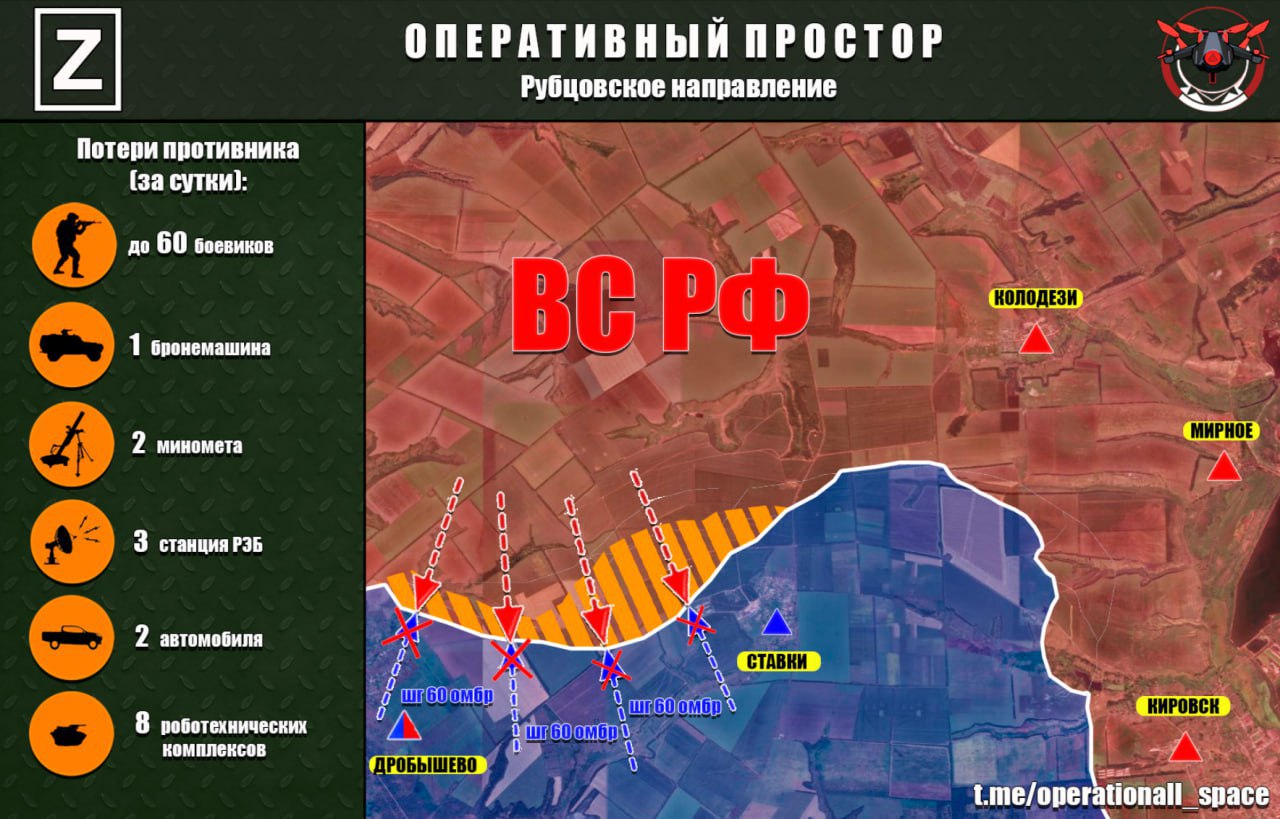 Противник провёл четыре безуспешные контратаки силами штурмовых групп 60 омбр ВСУ в районе населённых пунктов Дробышево и Ставки, в результате было уничтожено до 25 боевиков.