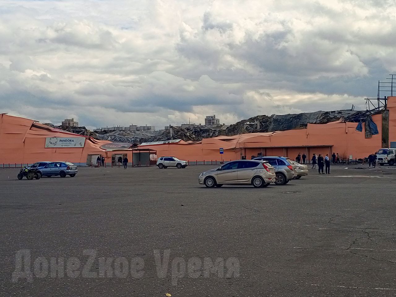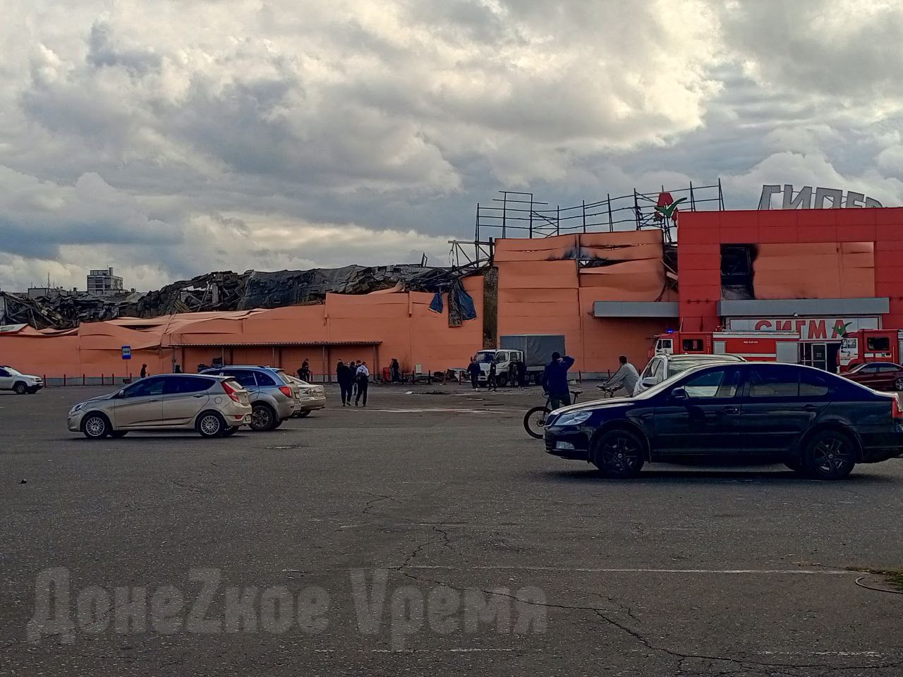 Огонь полностью потушен и к торговому центру идут дончане, чтобы своими глазами увидеть масштаб повреждений. Люди приезжают на велосипедах и машинах, паркуясь подальше, чтобы не мешать спасателям. Кто-то даже приехал на квадроцикле.