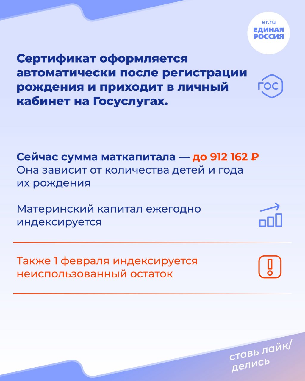 Материнский капитал — это хорошая поддержка для семей с детьми. Единая Россия обеспечила продление программы до 2030 года. Также маткапитал ежегодно индексируется на величину фактической инфляции.