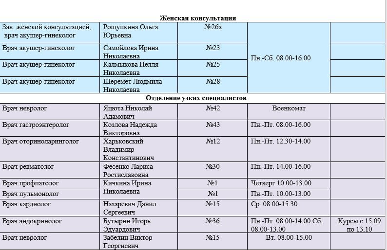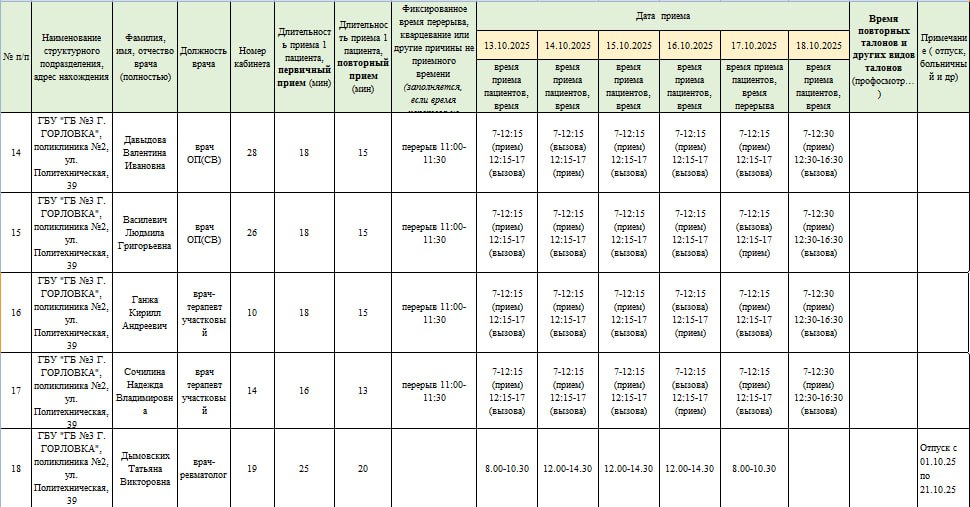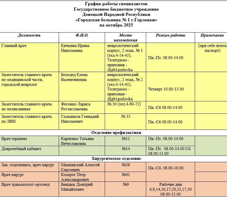График работы специалистов ГБУ ДНР «Городская больница № 1 г. Горловки» и ГБУ ДНР «Городская больница № 3 г. Горловки»