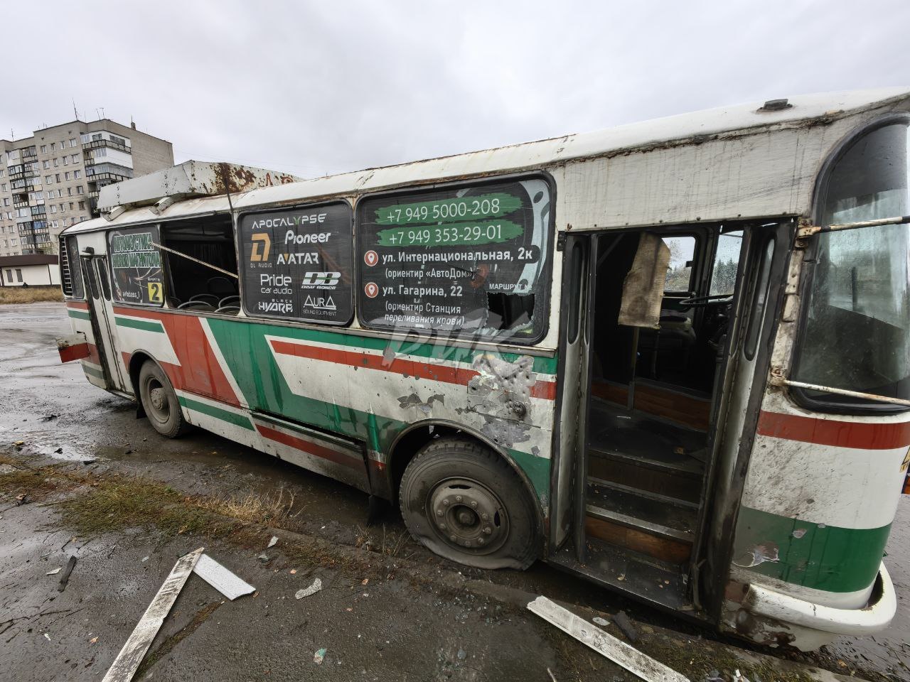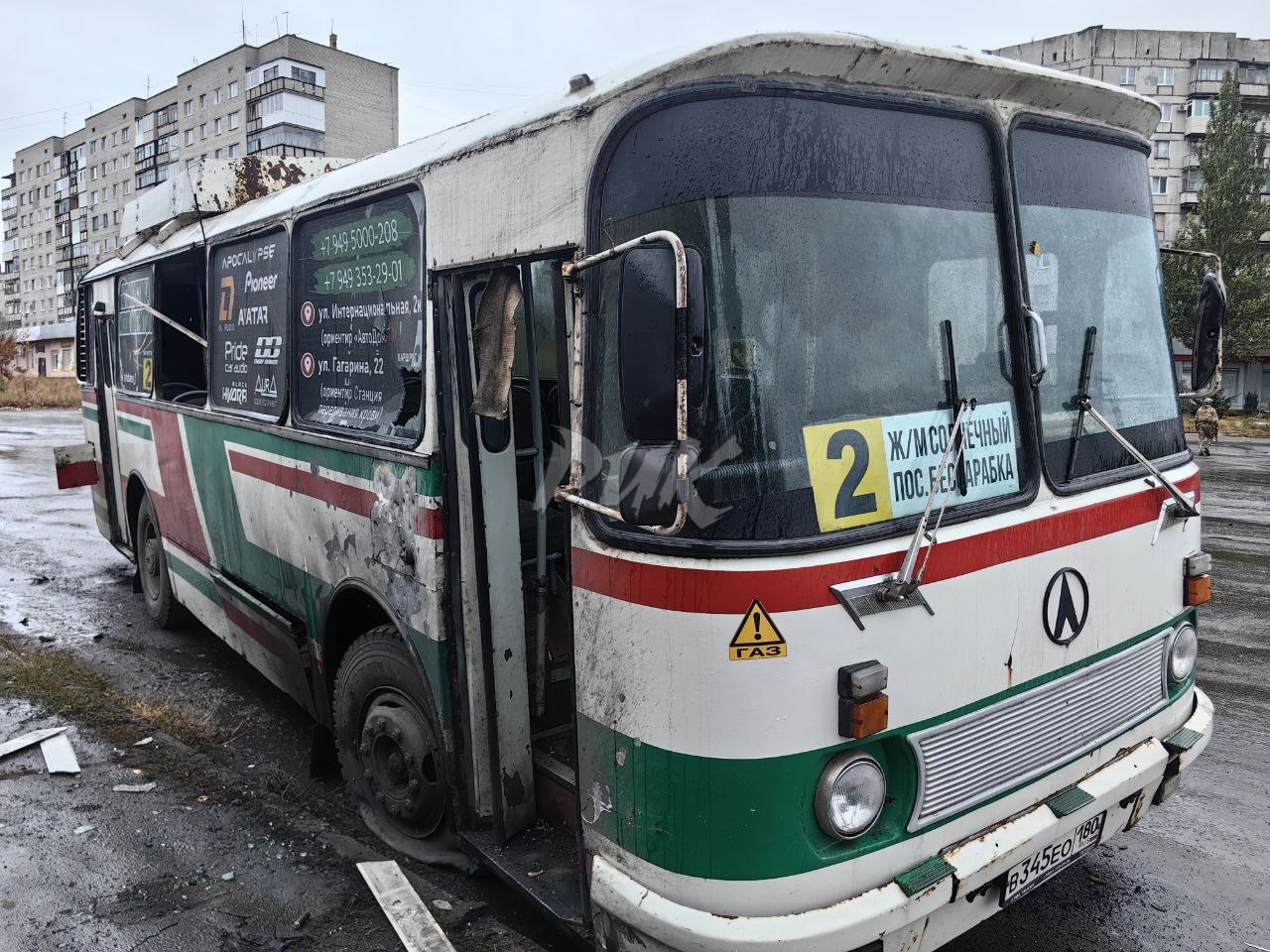 Автобус, поврежденный сегодня в результате атаки дрона украинских террористов в жилмассиве «Комсомолец» (Никитовский район Горловки).