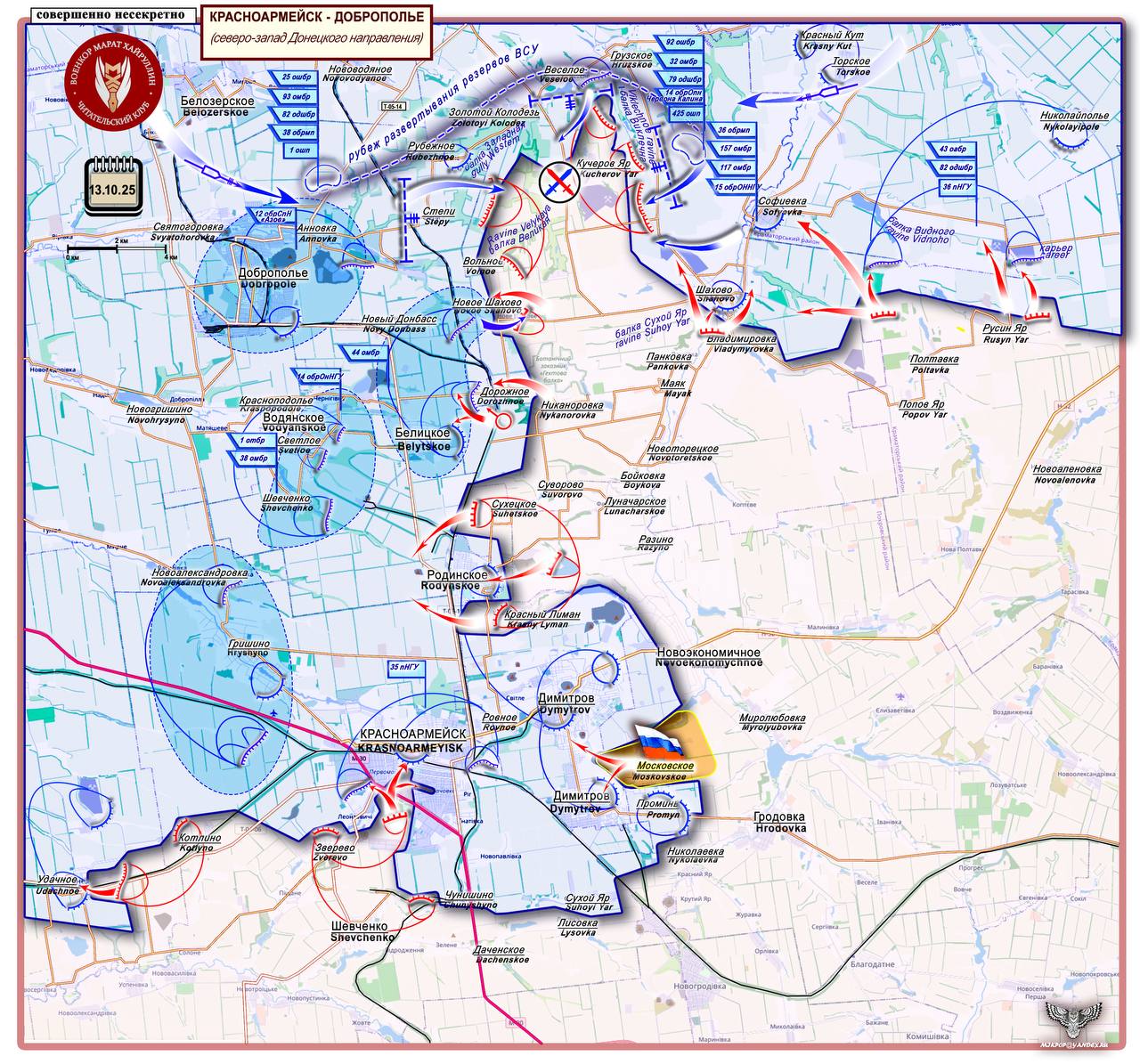 На Красноармейском участке, где противник сосредоточил большие силы, идет упорное дробление его обороны. Вчера был освобожден н.п. Московское (48°1647с.ш. 37°1839в.д. - население около 190 жителей). Это восточное предполье Покровского узла обороны ВСУ, основные позиции которого расположены в поселке Димитров, вытянувшемся с севера на юг почти на 7 километров, на сильно пересеченной местности с промышленной и городской застройкой.