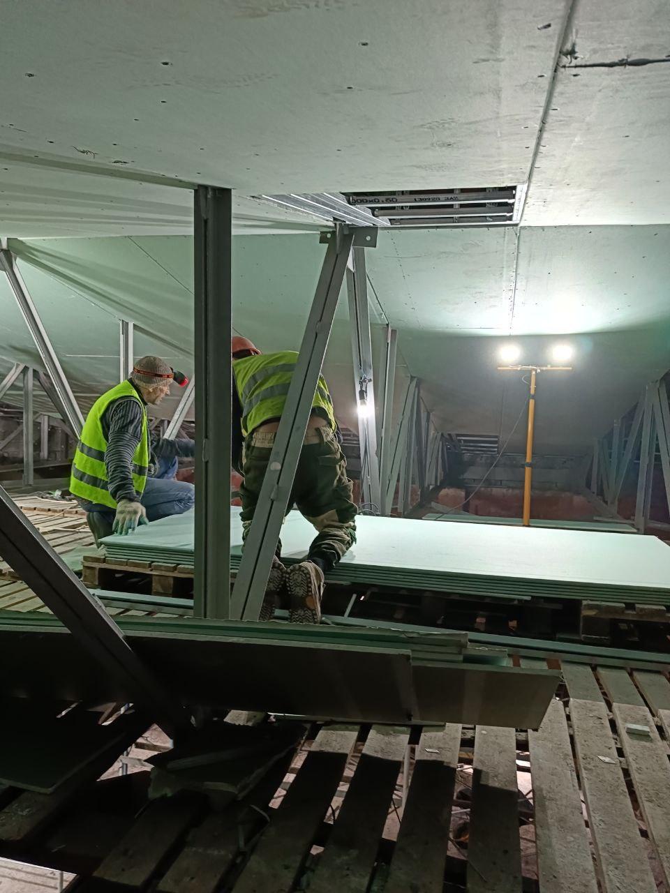 Нижегородские специалисты монтируют направляющие для гипсоволокнистых листов и обшивают помещения листами ГВЛ.