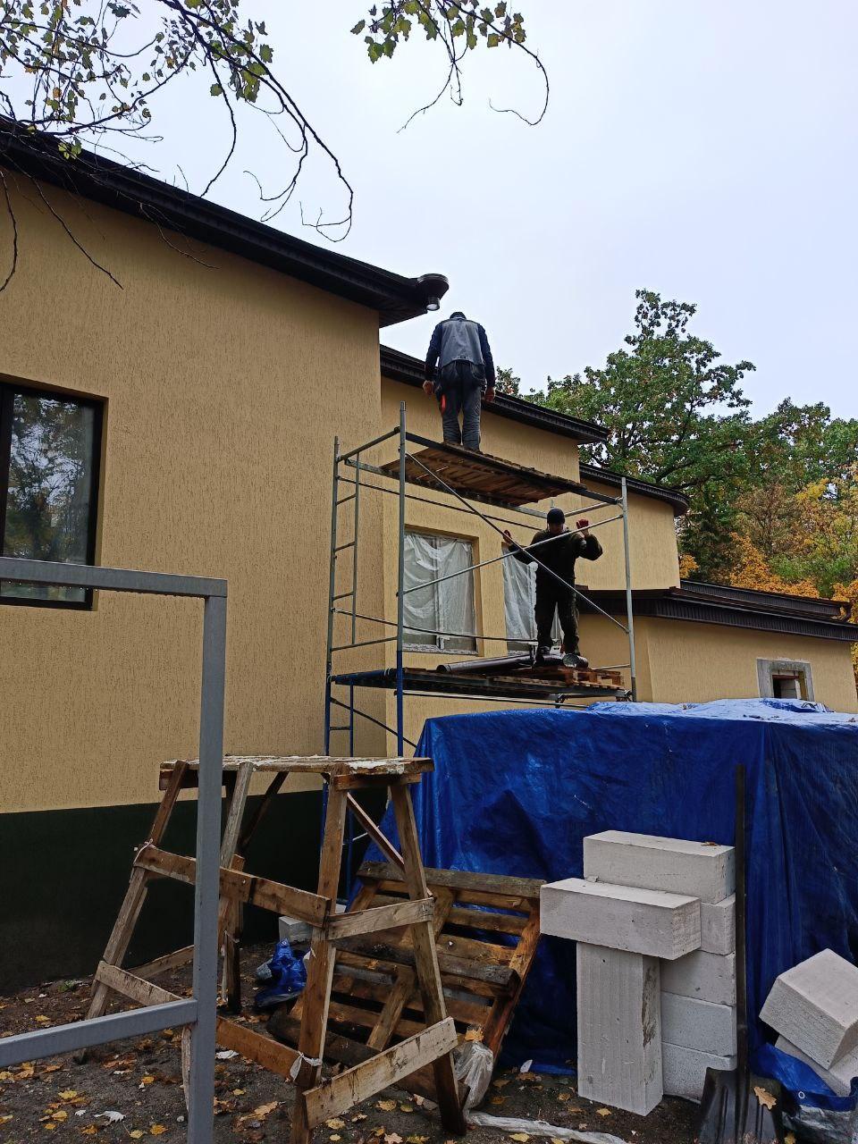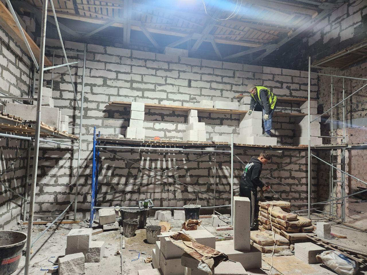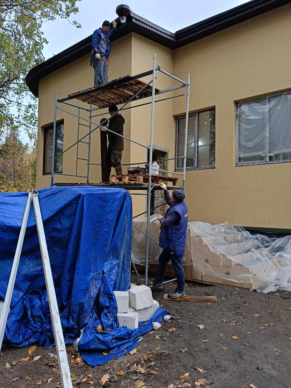 Параллельно рабочие ведут монтаж перегородок и окраску фасада здания.