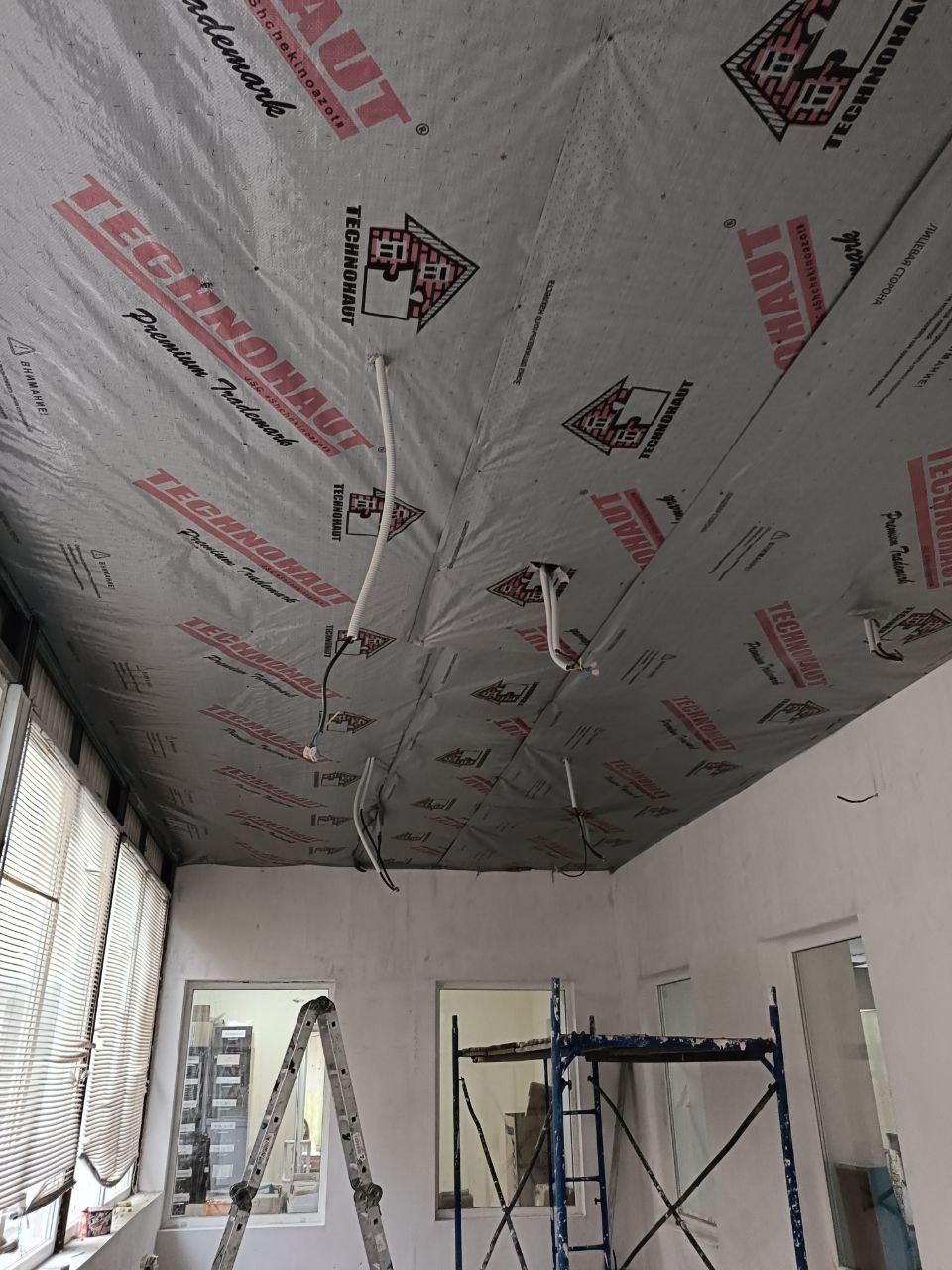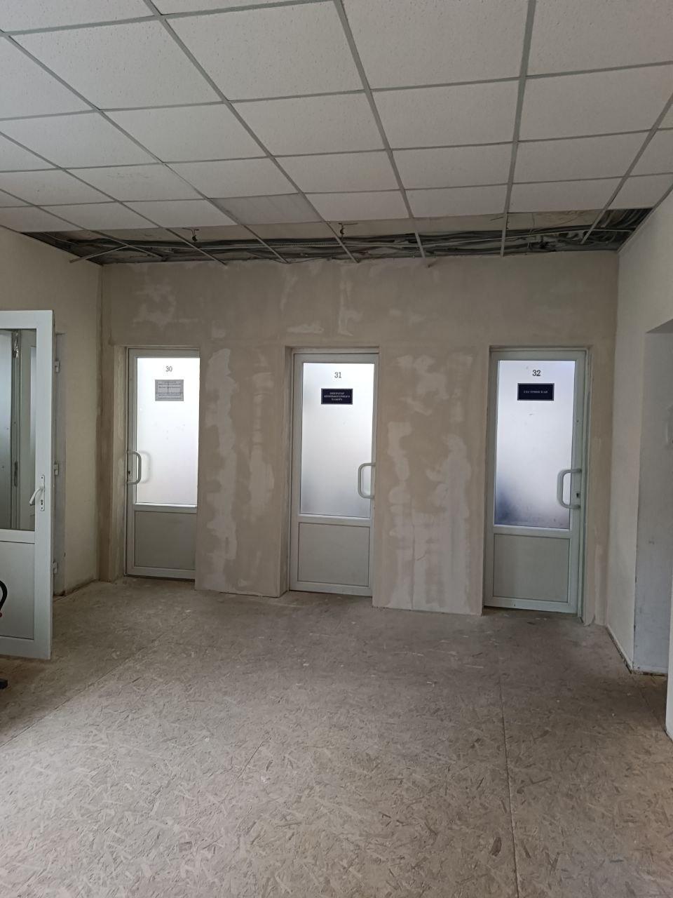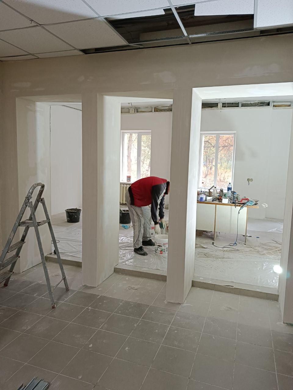 Также подрядчики выполнили штукатурные работы, параллельно ведется установка современного потолка, замена дверей и строительство нового крыльца.