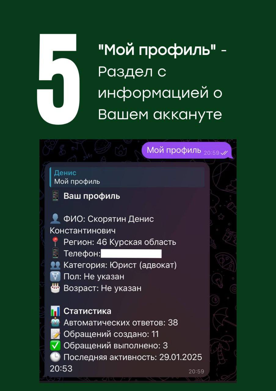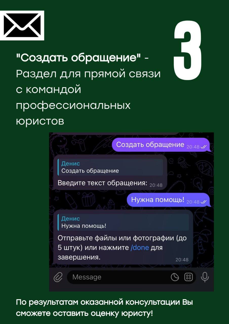 Мы подготовили инструкцию по пользованию ботом «КСВО-Право», чтобы сразу при регистрации заявители понимали, как получить помощь.