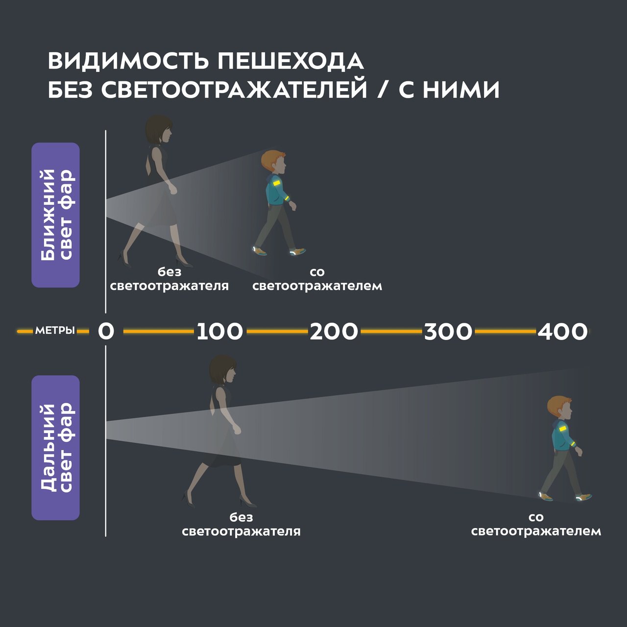 В тёмное время суток аварии с пешеходами становятся самым распространенным видом ДТП в России. Вечерние происшествия чаще происходят потому, что водители не успевают вовремя среагировать на внезапно появившихся пешеходов. Лучший способ избежать таких аварий — использовать одежду и аксессуары со светоотражающими элементами. Их использование снижает риск наезда на пешехода на 65–80%.
