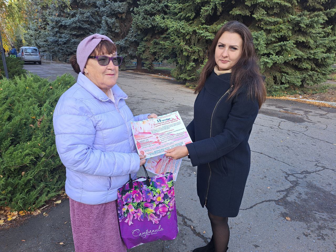Сегодня работники Светлодарского территориального отдела провели тематическую акцию, раздали женщинам города листовки и напомнили о важности регулярного самообследования, своевременного прохождения маммографии и посещения врача при первых подозрительных изменениях. В ходе акции были даны рекомендации по здоровому образу жизни, который помогает снизить риски развития рака молочной железы: правильное питание, отказ от вредных привычек, поддержание нормального веса и физическая активность.