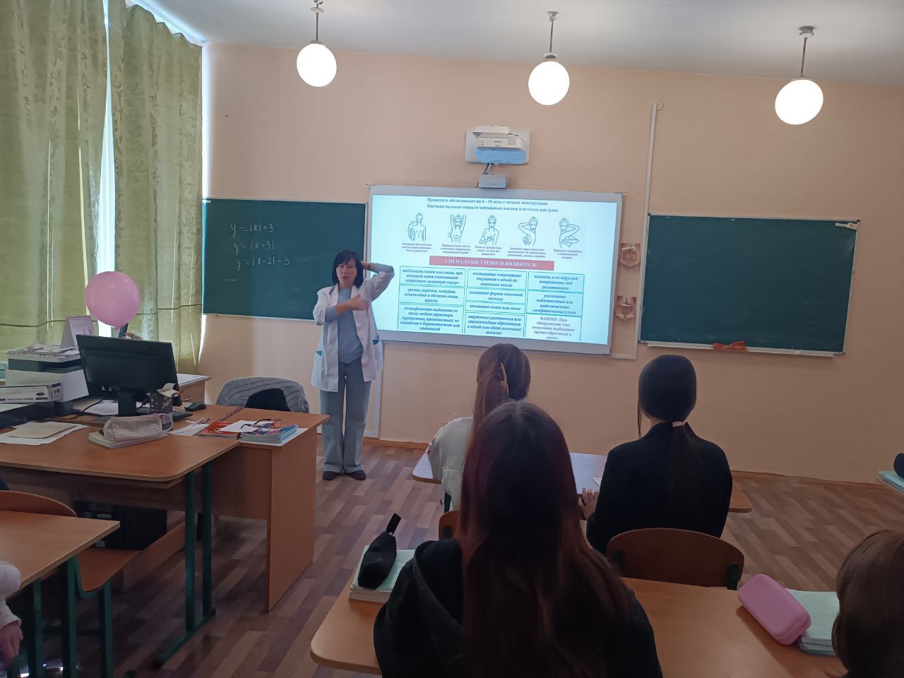 Медицинской сестрой кабинета по оказанию медицинской помощи несовершеннолетним Чермалыкской амбулатории ОПСМ была проведена беседа с работниками и старшеклассницами Чермалыкской школы на тему: