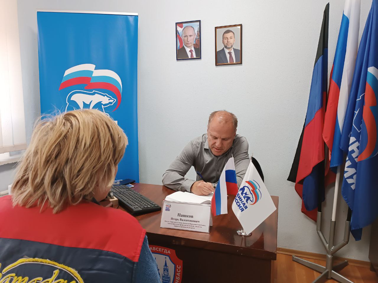 Сегодня, 15 октября, в Общественной приемной Партии «Единая Россия» в Пролетарском районе г. Донецка личный прием провел депутат Народного Совета Донецкой Народной Республики Игорь Пашков.