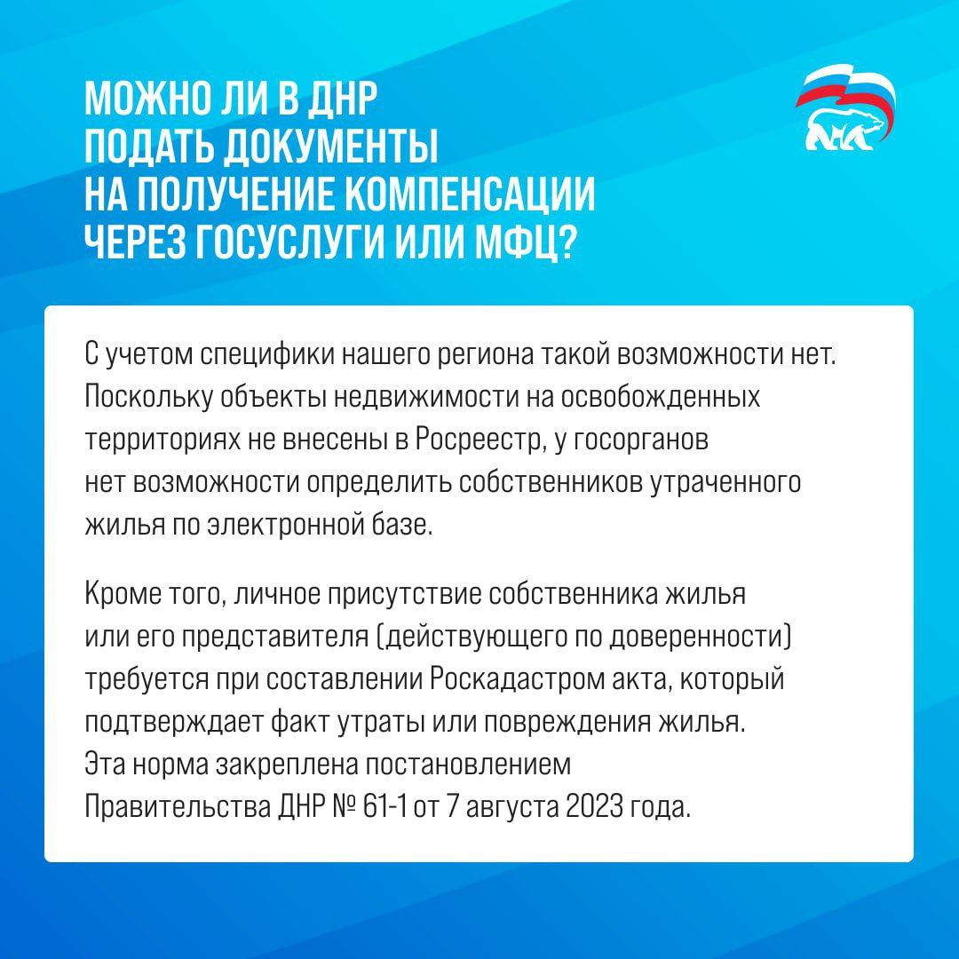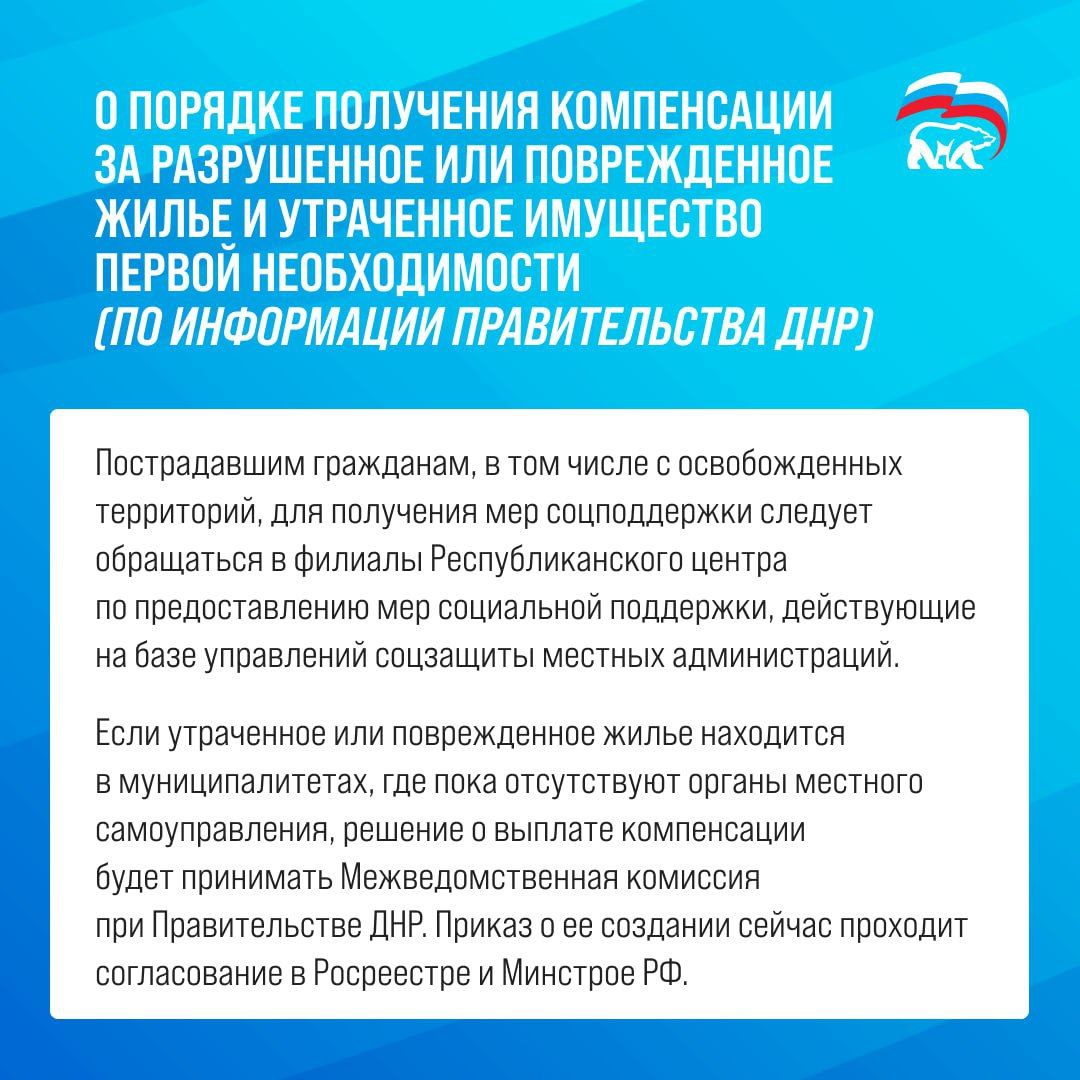 Продолжаем тему компенсаций за утраченное и поврежденное жилье и имущество первой необходимости. Мы сделали запрос в Правительство ДНР. Ответы кратко изложили в карточках.