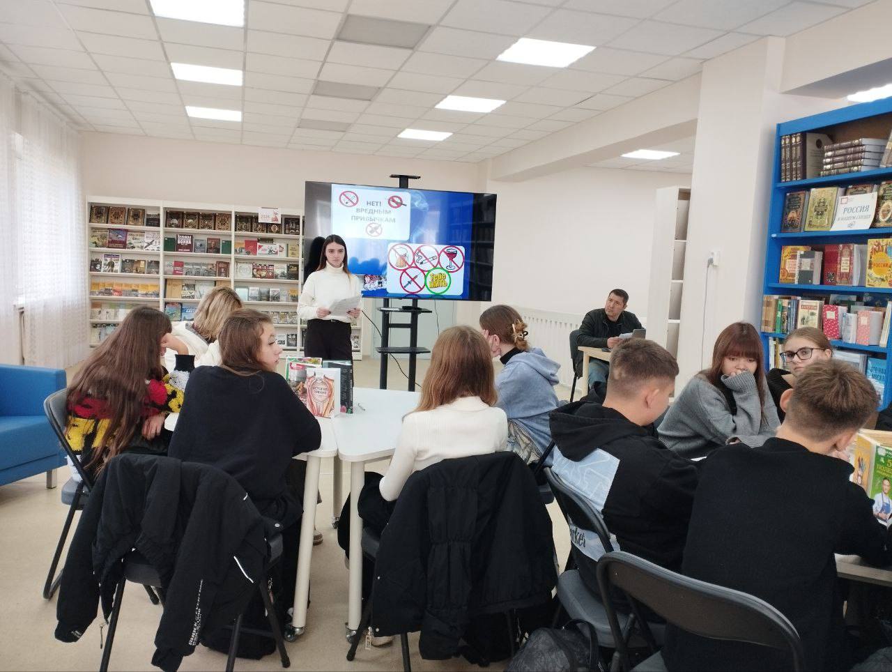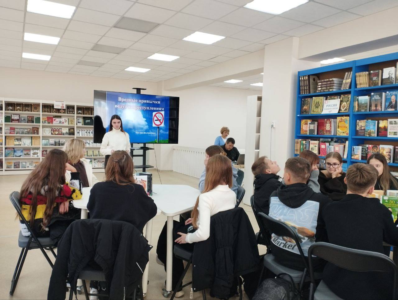 15 октября в читальном зале центральной городской модельной библиотеке состоялся час профилактики «Минздрав предупреждает: вредные привычки ведут к преступлениям» для подростков СШ №1 городского округа Харцызск. Ведущая, библиотекарь читального зала Алина Великдань рассказала ребятам, как формируются привычки, их виды и влияние на здоровье.