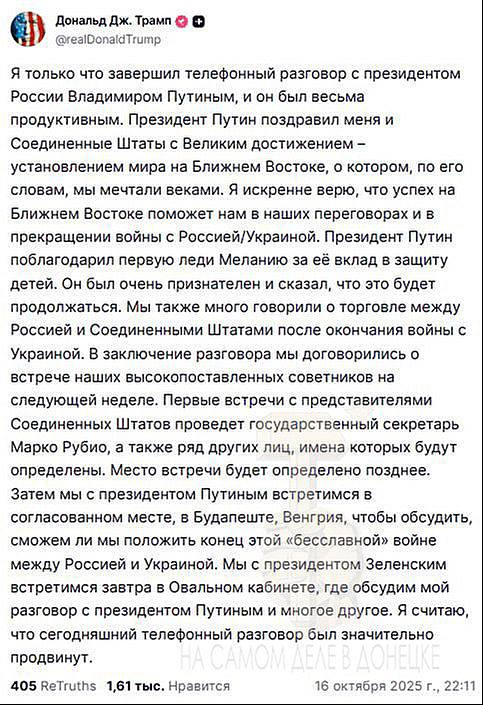 Я только что завершил свой телефонный разговор с президентом России Владимиром Путиным, и он был очень продуктивным.Президент Путин поздравил меня и Соединенные Штаты с великим достижением — установлением мира на Ближнем Востоке, о чем, по его словам, мечтали веками. Я действительно верю, что успех на Ближнем Востоке поможет в наших переговорах по прекращению войны с Россией/Украиной.