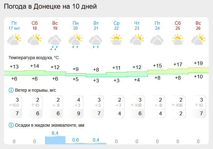 В ближайшие 10 дней, с 17 по 26 октября в столице ДНР температура воздуха днем будет колебаться от +19 до +8 градусов по Цельсию. В холодные дни синоптики передают дождь, а небо будет пасмурным с прояснениями все эти дни.