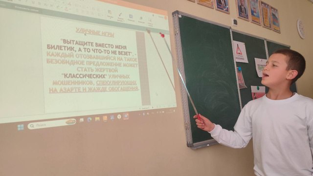 Тимур вместе с одноклассниками подготовил наглядную презентацию "Как не стать жертвой мошенников". Урок прошел в формате интерактивной игры: ученики с увлечением решали задачи, работали в команде и демонстрировали свои знания в области безопасности в сети Интернет и противодействия телефонным мошенникам.
