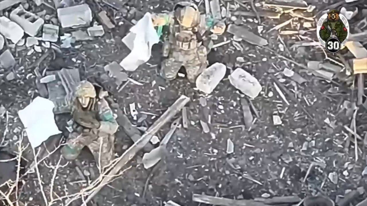 Пара украинских солдат сдается российскому дрону в центре Покровска (1:36). Видео: @OGMSBR30