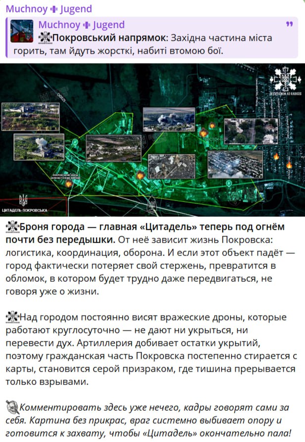 Активные бои сейчас разворачиваются вокруг промзоны на северо-западе Покровска. "Если этот объект падёт — город фактически утратит свой стержень, превратится в обломок, по которому будет трудно даже передвигаться", — пишет Мучной.