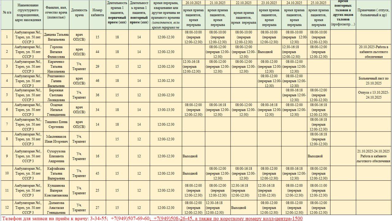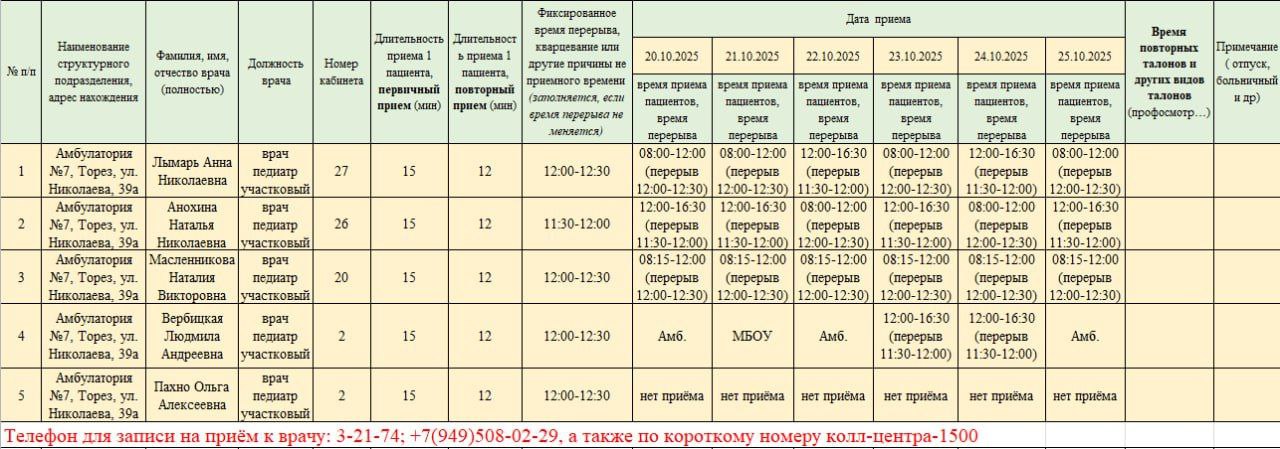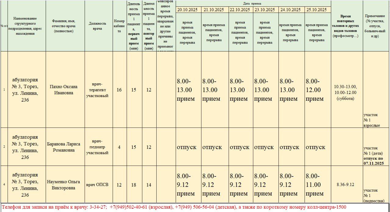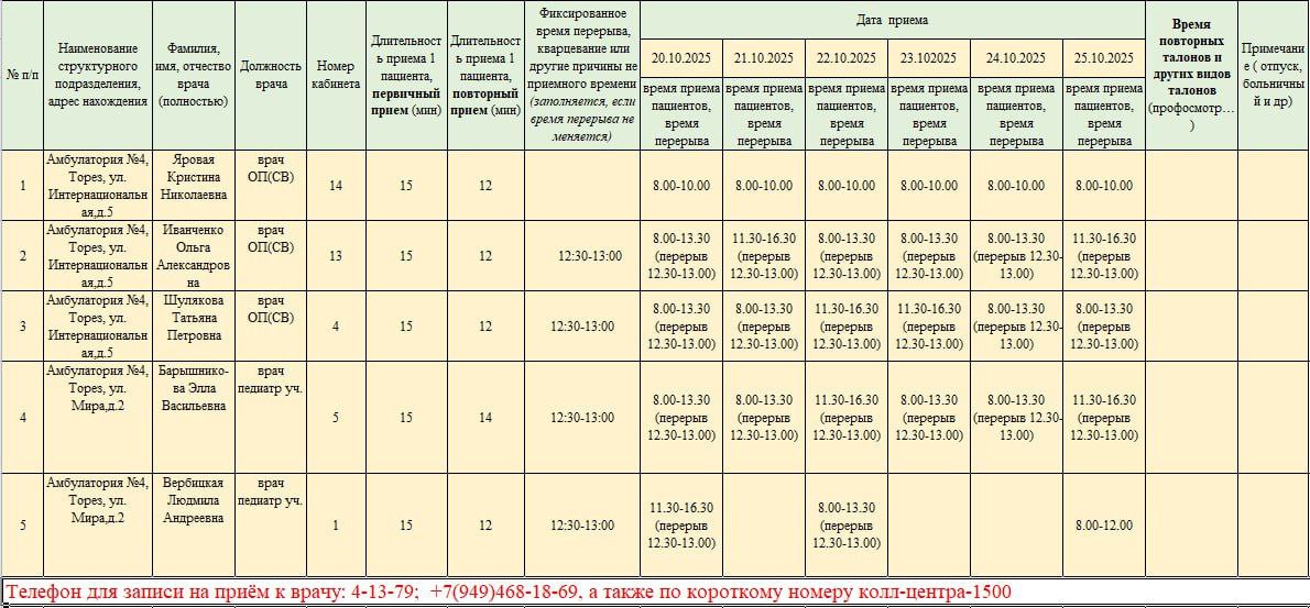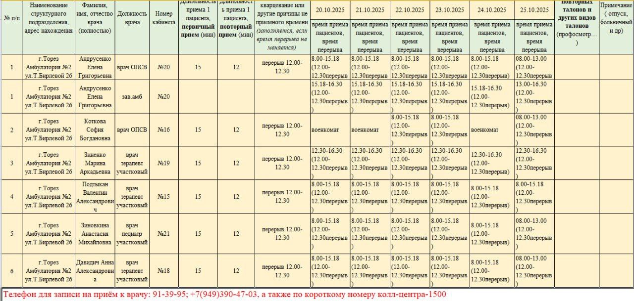 График приёма пациентов врачами амбулаторий ГБУ ДНР "ЦПМСП г. ТОРЕЗА" с 20.10.2025-25.10.2025г