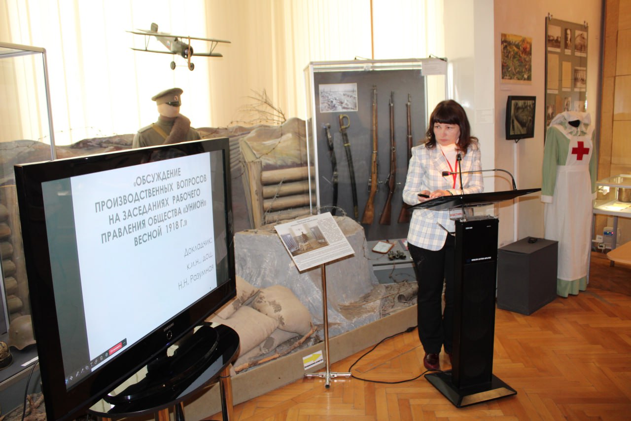 Доцент кафедры региональной истории Надежда Разумная на конференции выступила с докладом «Обсуждение производственных вопросов на заседаниях рабочего правления общества «Унион» весной 1918 года».