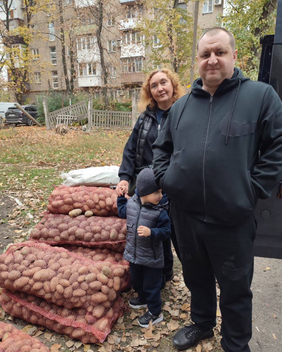 Разгрузили только одну фуру, еще впереди едут овощи, которые будут раздаваться нашим подопечным из семей военнослужащих.