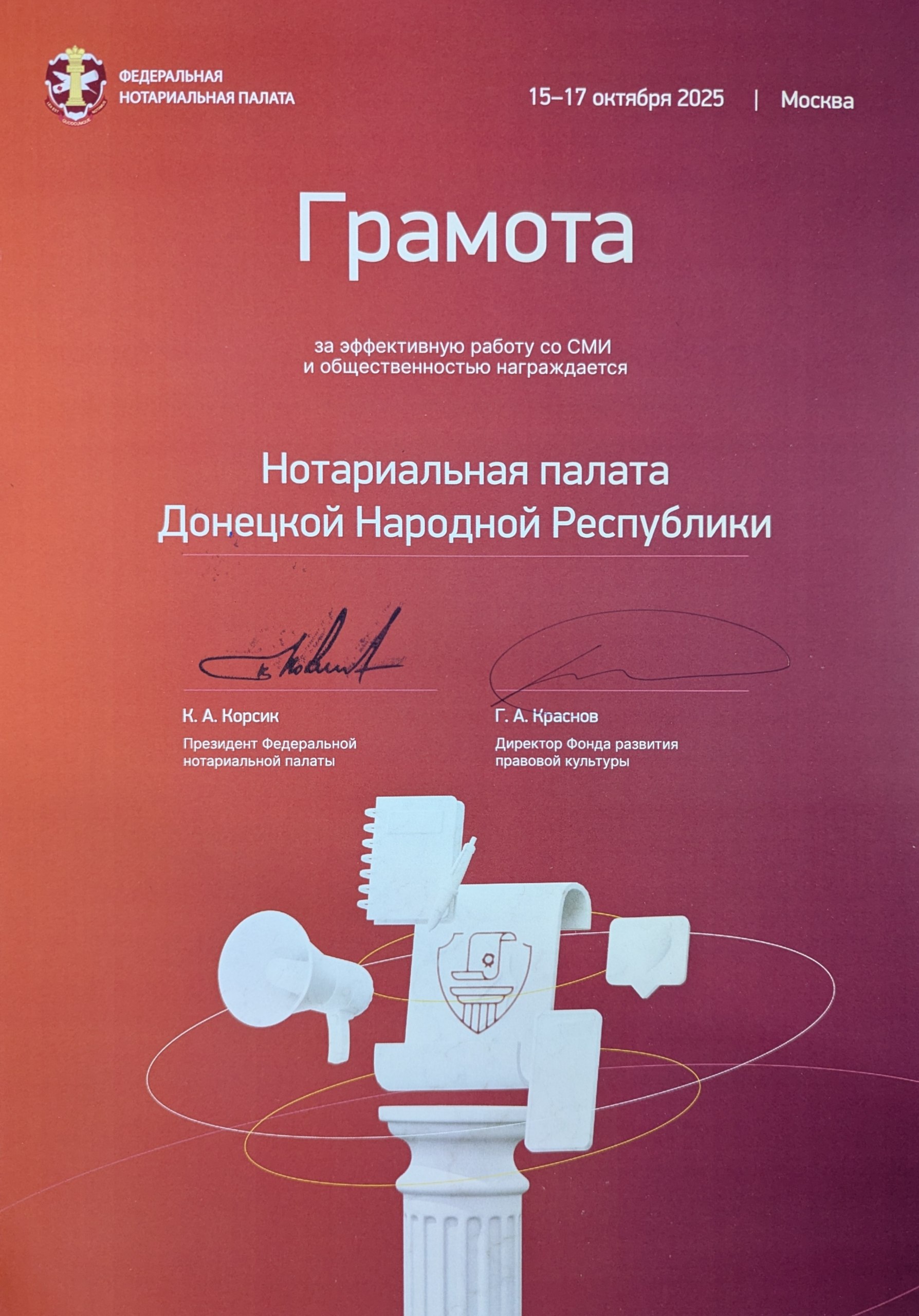 В рамках этого мероприятия Нотариальная палата Донецкой Народной Республики была отмечена почётной грамотой за эффективную работу со средствами массовой информации и общественностью. Эта награда имеет для нас особое значение, ведь она подтверждает, что усилия Палаты по формированию и поддержанию позитивного имиджа нотариата находят признание на федеральном уровне.