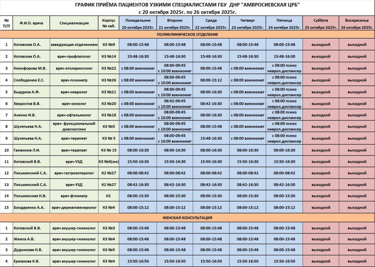 График приема врачей поликлинического отделения ГБУ ДНР "Амвросиевская ЦРБ"