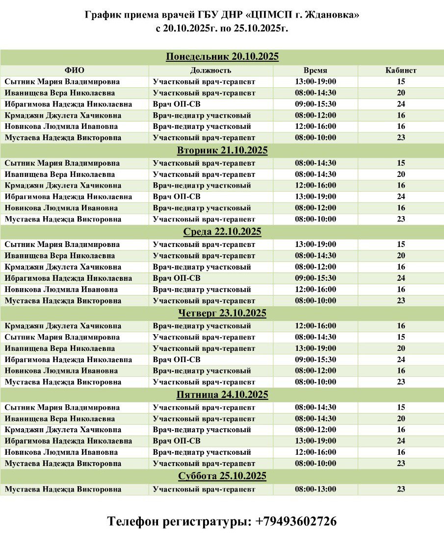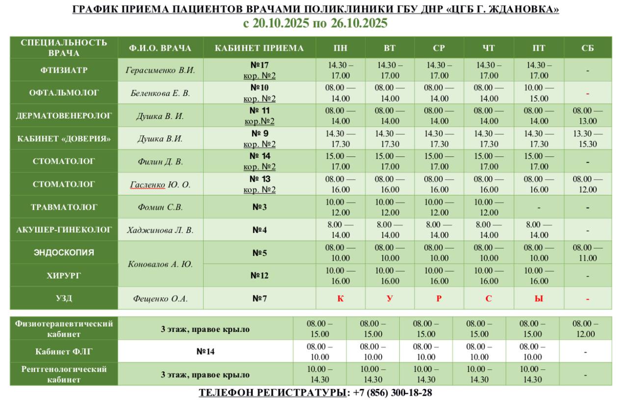 Актуальный график приема специалистами ГБУ ДНР «ЦГБ г. Ждановка» с 20.10.2025 по 26.10.2025