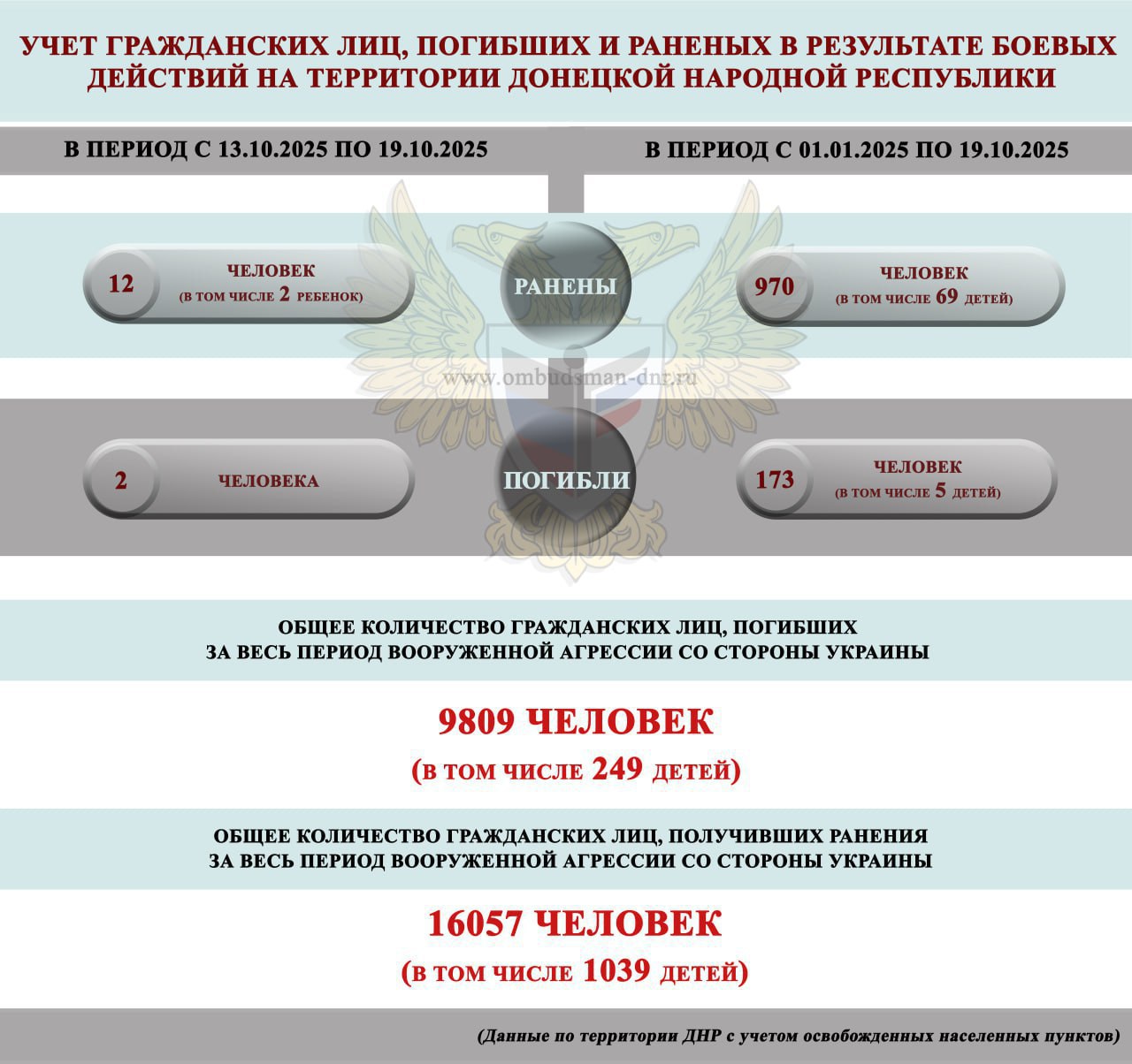 За прошедшую неделю с 13 по 19 октября в ДНР в результате обстрелов ВСУ погибли 2 мирных жителя, ранения получили 12 мирных жителей, в том числе двое детей.