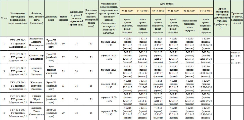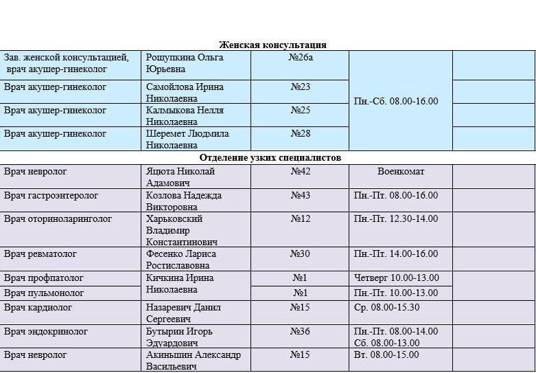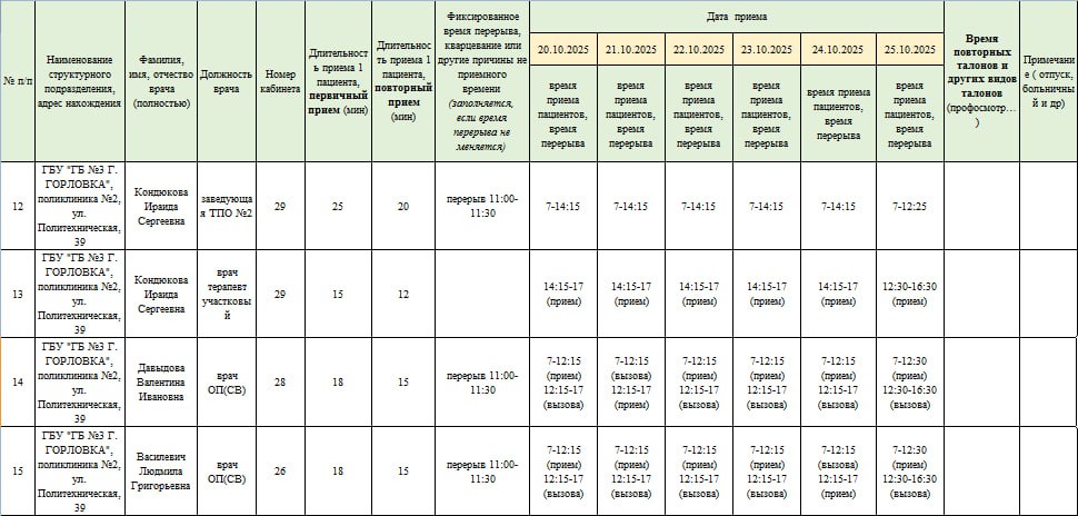 График работы специалистов ГБУ ДНР «Городская больница № 1 г. Горловки» и ГБУ ДНР «Городская больница № 3 г. Горловки»