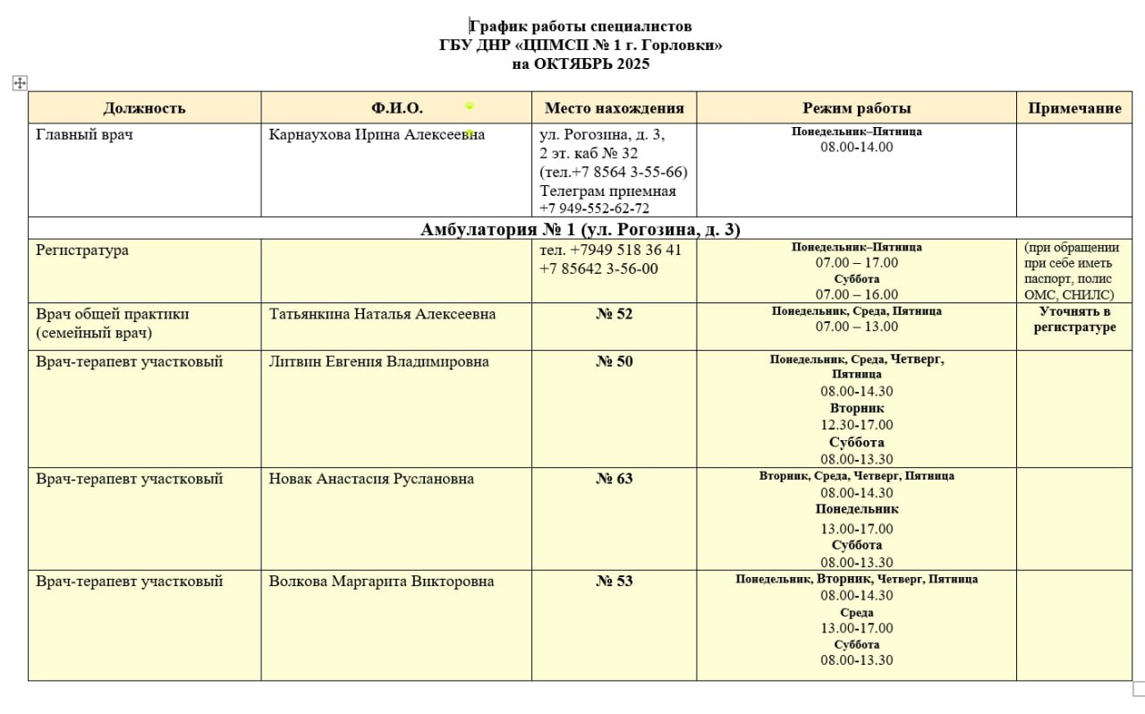 Иван Приходько: График работы специалистов ГБУ ДНР «ЦПМСП № 1 г. Горловки», ГБУ ДНР «ЦПМСП № 2 г. Горловки», ГБУ ДНР «ГСП № 4 г.Горловки», ГБУ ДНР «ЦОМД г. Горловки»
