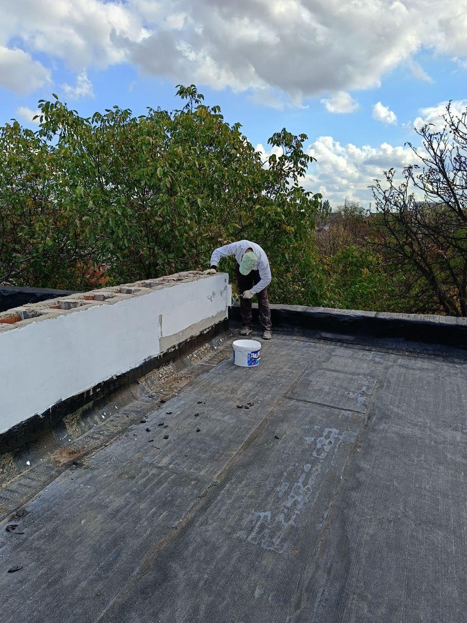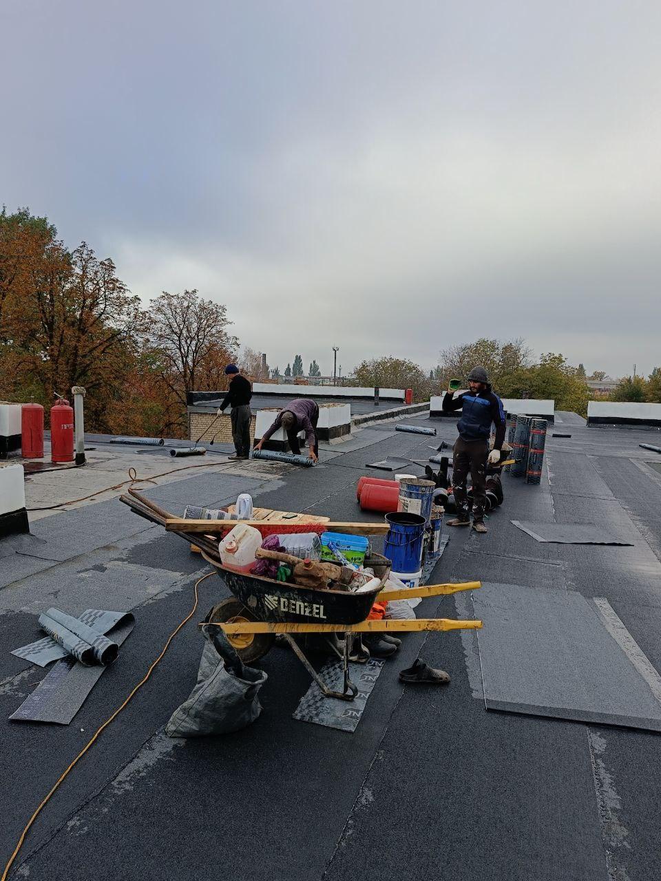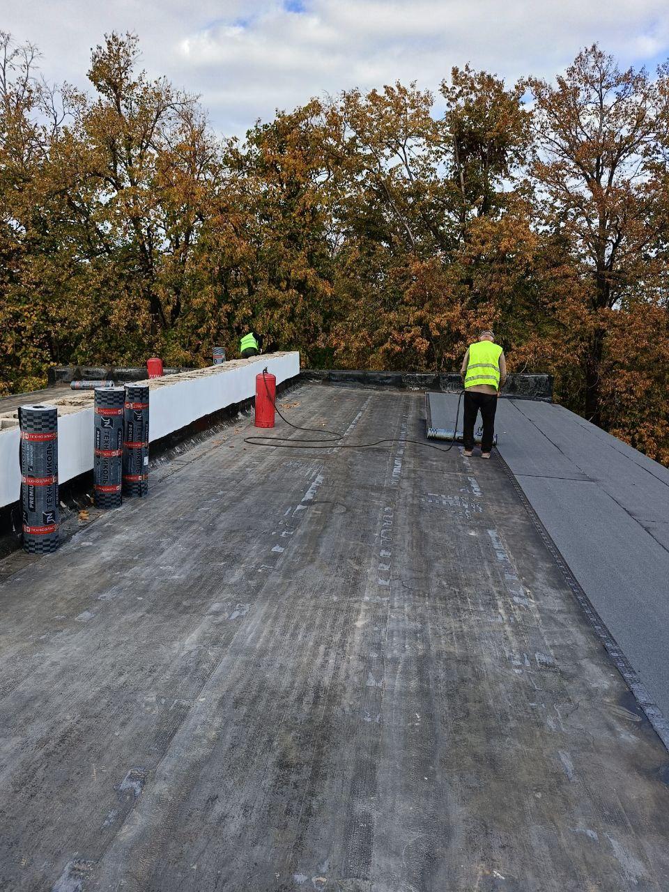 Параллельно на крыше подрядчики демонтировали пожарные ограждения и старое кровельное покрытие, после чего приступили к монтажу цементно-стружечных плит и укладке многослойного кровельного ковра.