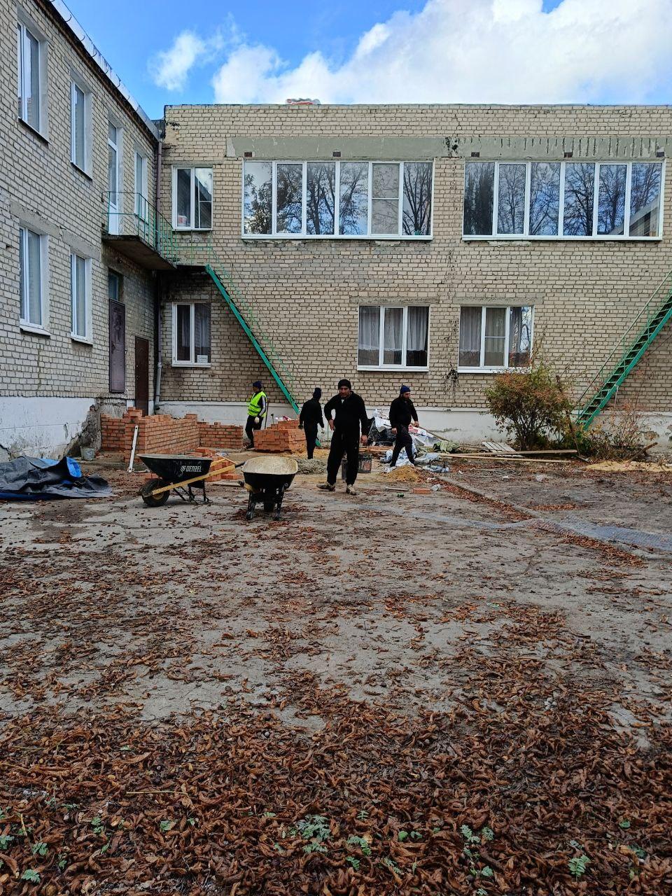 Рабочие возводят новую кладку во входных группах детского сада № 17 "Теремок".