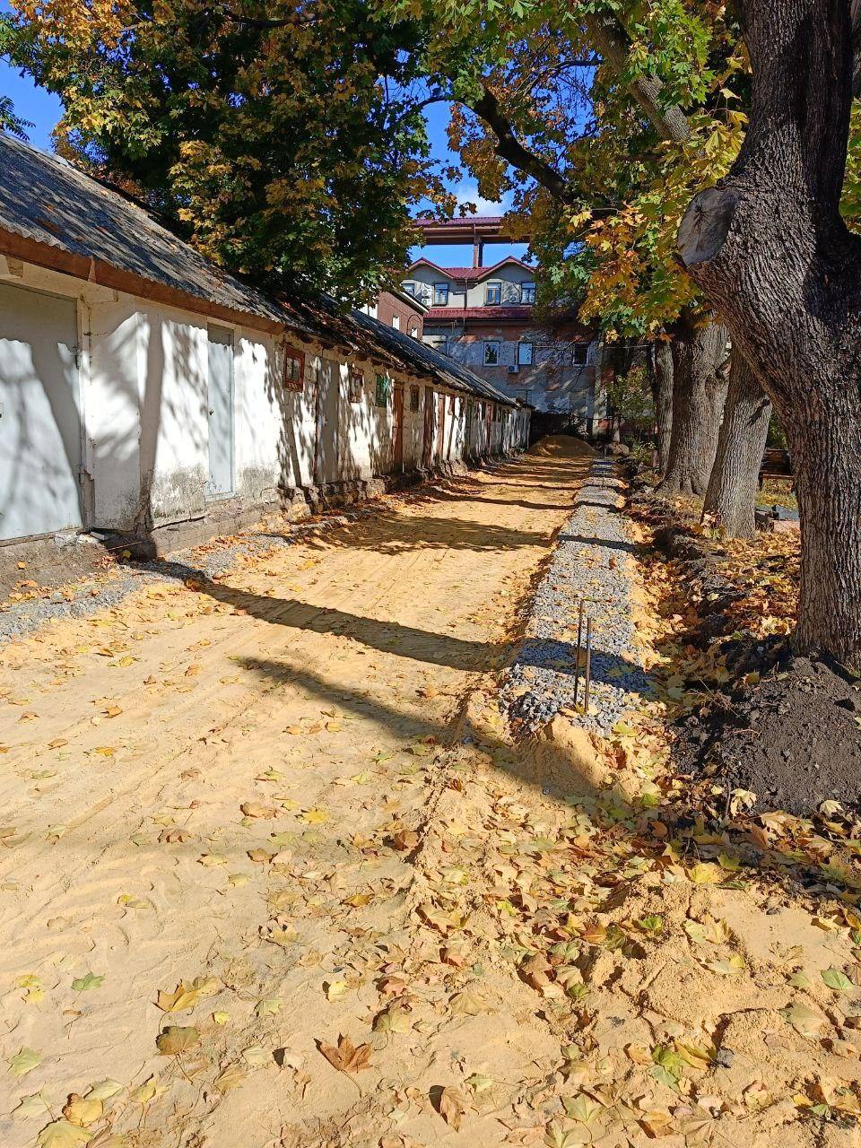 Строители продолжают разборку старых бордюров, покрытий из асфальта и булыжников, параллельно укладывают многослойную подушку из песка и щебня и новые бортовые камни.