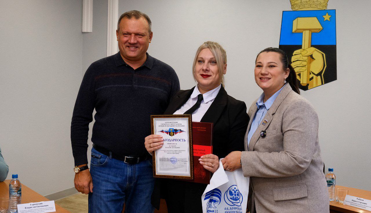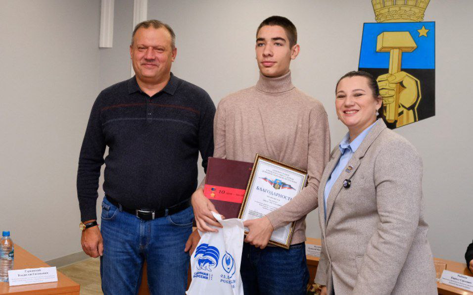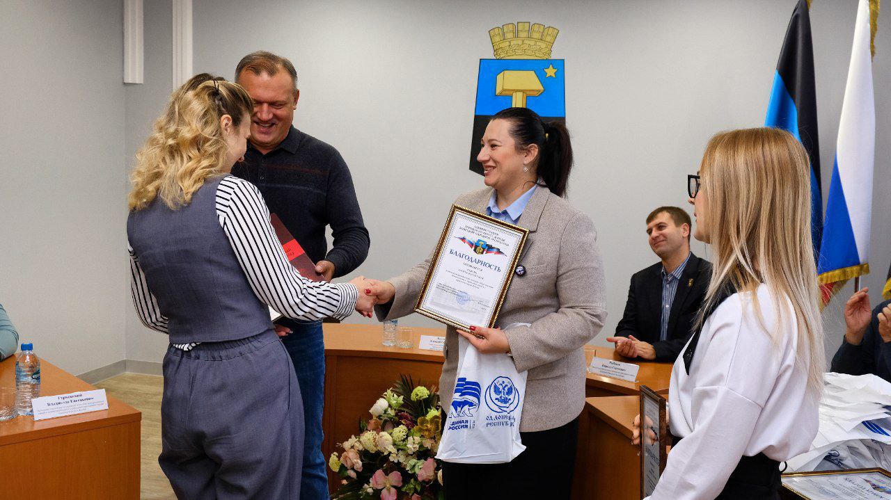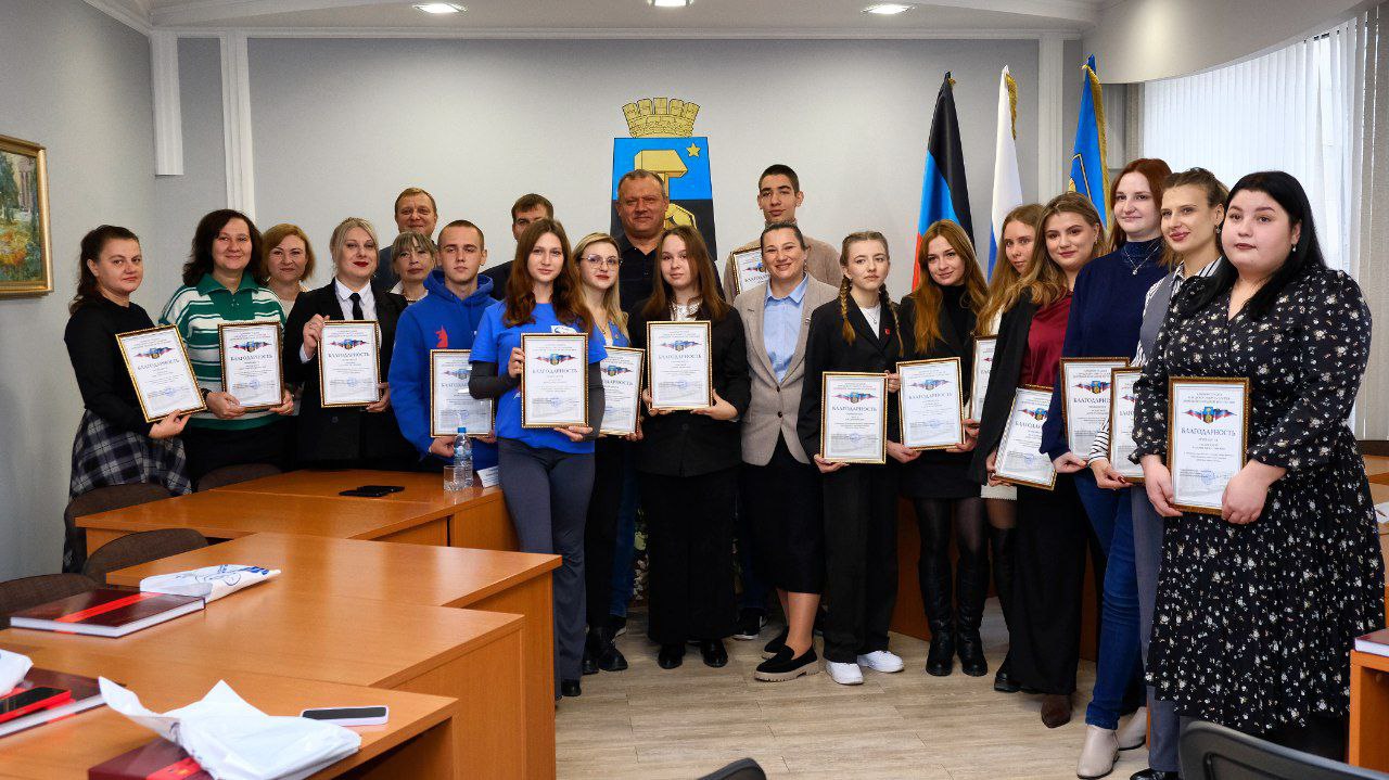 Вместе с Главой муниципального образования городского округа Донецк Алексеем Кулемзиным наградили волонтёров, которые активно оказывали помощь в голосовании за общественные пространства в рамках федерального проекта «Формирование комфортной городской среды».