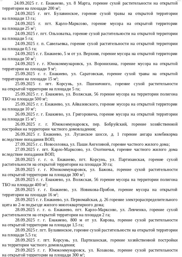Согласно предоставленнойотделом надзорной деятельности и профилактической работы городского округа Енакиево Управления надзорной деятельности и практической работы Главного управления МЧС России по ДНРинформации в период с 08:00 24 сентября 2025 г. по 08:00 1 октября 2025 г. на территории городского округа Енакиево было зарегистрировано 32 сообщения о пожаре.